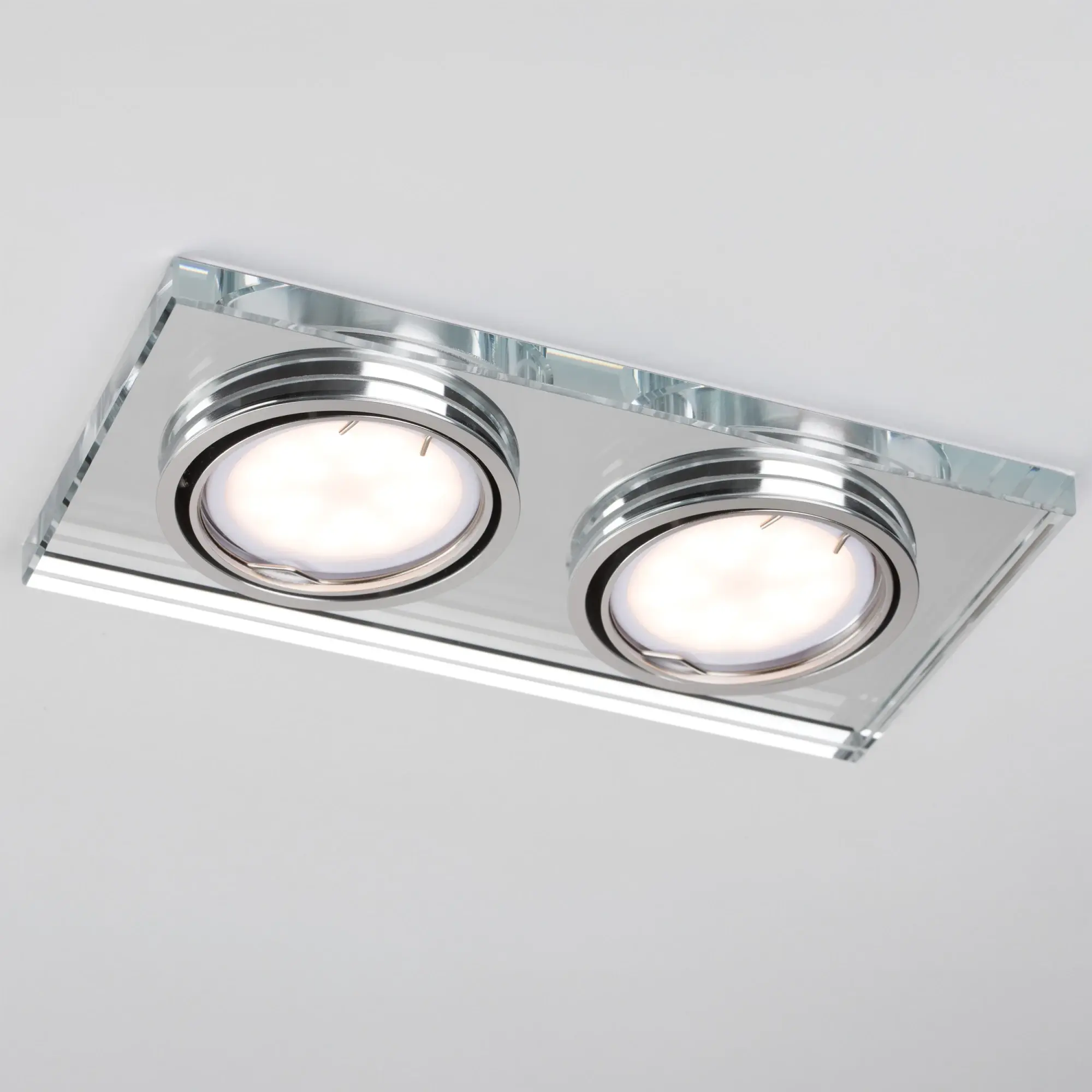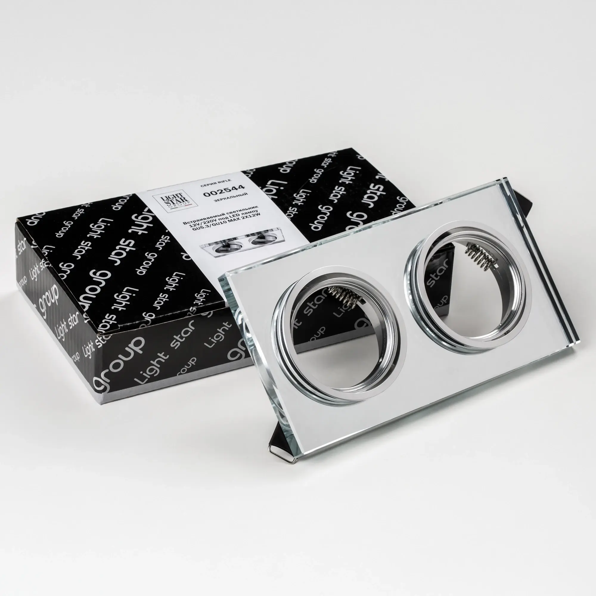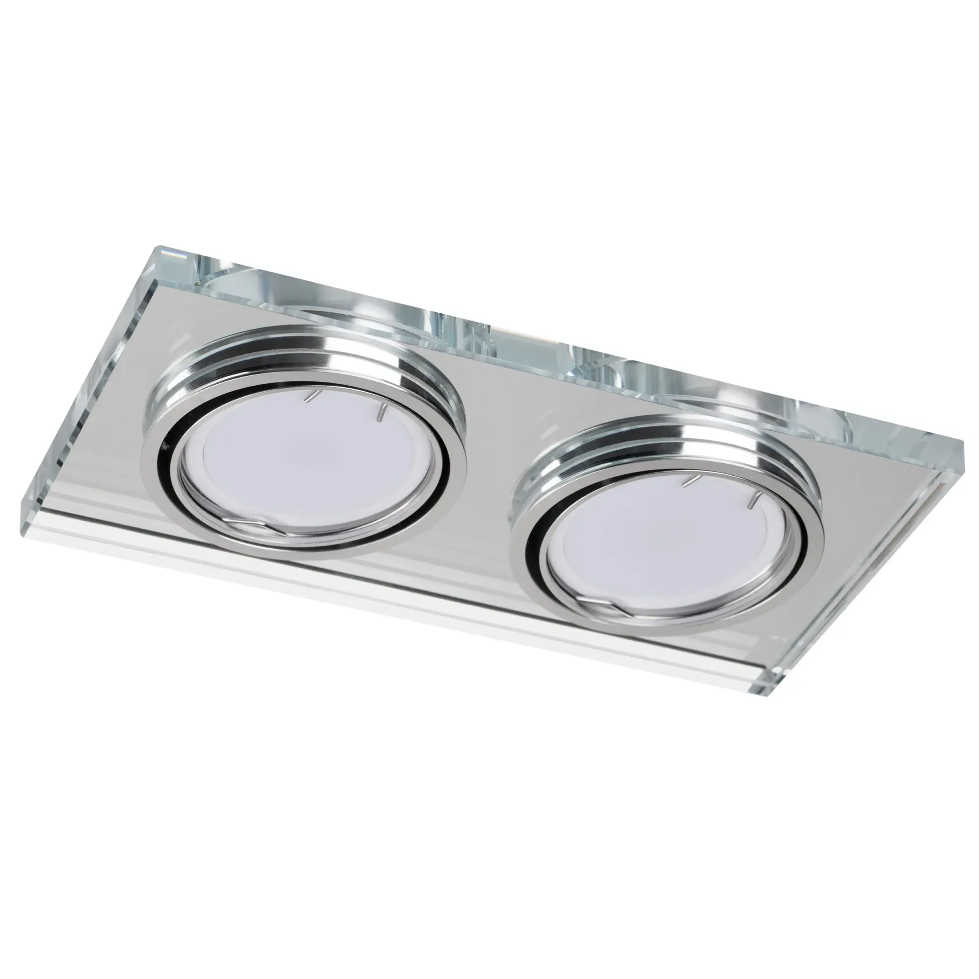 Врезное отверстие: d2х70 h15; Внешние габариты: D170х90 Н10; Материал - основание/плафон: металл / стекло; Цвет-основание/плафон: хром/зеркальный; Лампа: 12В/220В MR16/HP16 Gu5.3/GU10 max 50Вт;