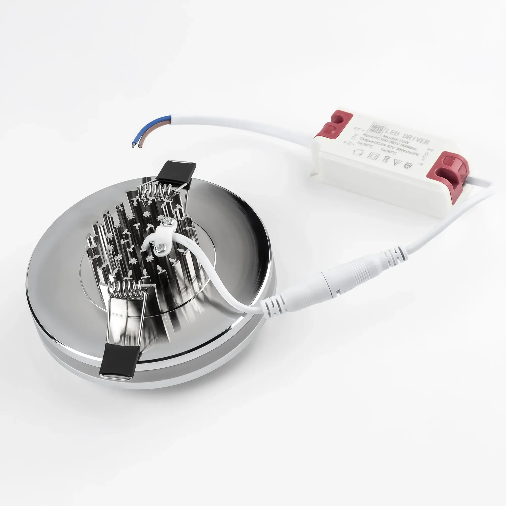 Врезное отверстие: d65 h40; Внешние габариты: D110 H20; Материал - основание/плафон: металл / акрил ; Цвет-основание/плафон: хром/матовый; Лампа: LED 220V 15Вт=150Вт, Световой поток: 1200LM; Особенности: температура металлического основания может варьироваться от 60 до 80 градусов, из-за чего необходимо использовать термокольцо (при применении в натяжных потолках); 3000К H ТРАНСФОРМАТОР ВХОДИТ В КОМПЛЕКТ;