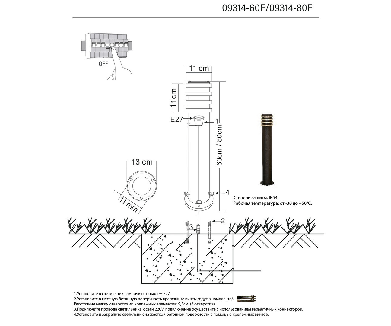 09314-80F,19 Светильник уличный Глари черный w11*11 основание d13 h80 E27 1*60w