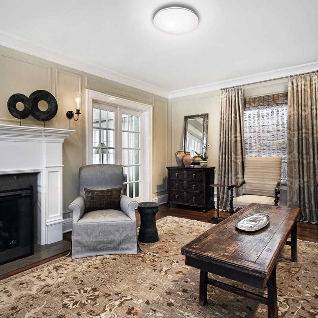 Светильник 2051/DLN линии LEKA состоит из металлического основания (базы) и пластикового рассеивателя. Материал рассеивателя — высококачественный акрил белого цвета с глянцевой поверхностью, обеспечивающий светильнику равномерное рассеивание и хорошее светопропускание. Форма плафона: круглая, декорирована ободом цвета хром и прозрачными точками, придающими включенному светильнику красивый эффект «звездного мерцания» и переливания. Степень защиты IP43 позволяет использовать светильник в определенных зонах влажных помещений. В комплект входит LED-модуль с линзами мощностью 48 Вт, соответствующей лампе накаливания 515 Вт, также переключатель температуры цвета (ССT) на драйвере, с помощью которого осуществляется изменение цветовой температуры 3000/4000/6000 К и переход светильника в режим теплого/белого/холодного света. Для установки необходимого режима рекомендуется использовать удлиненный тонкий предмет типа небольшой отвертки.