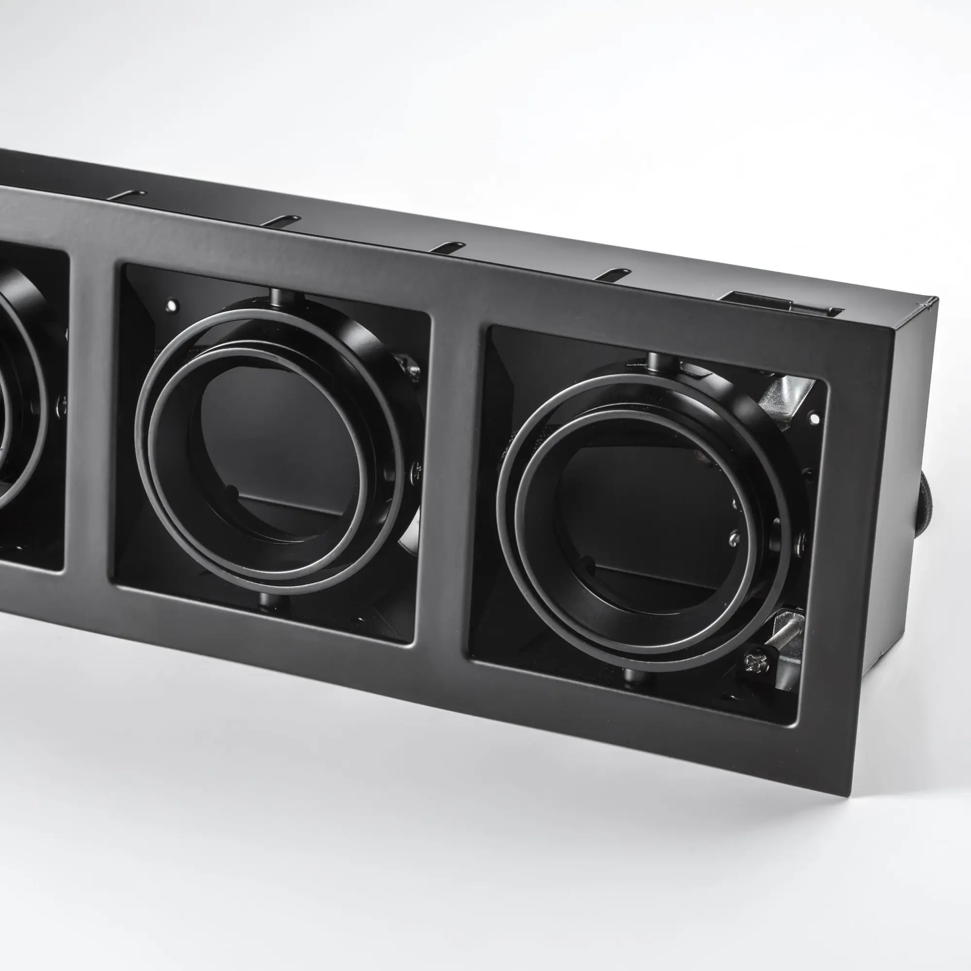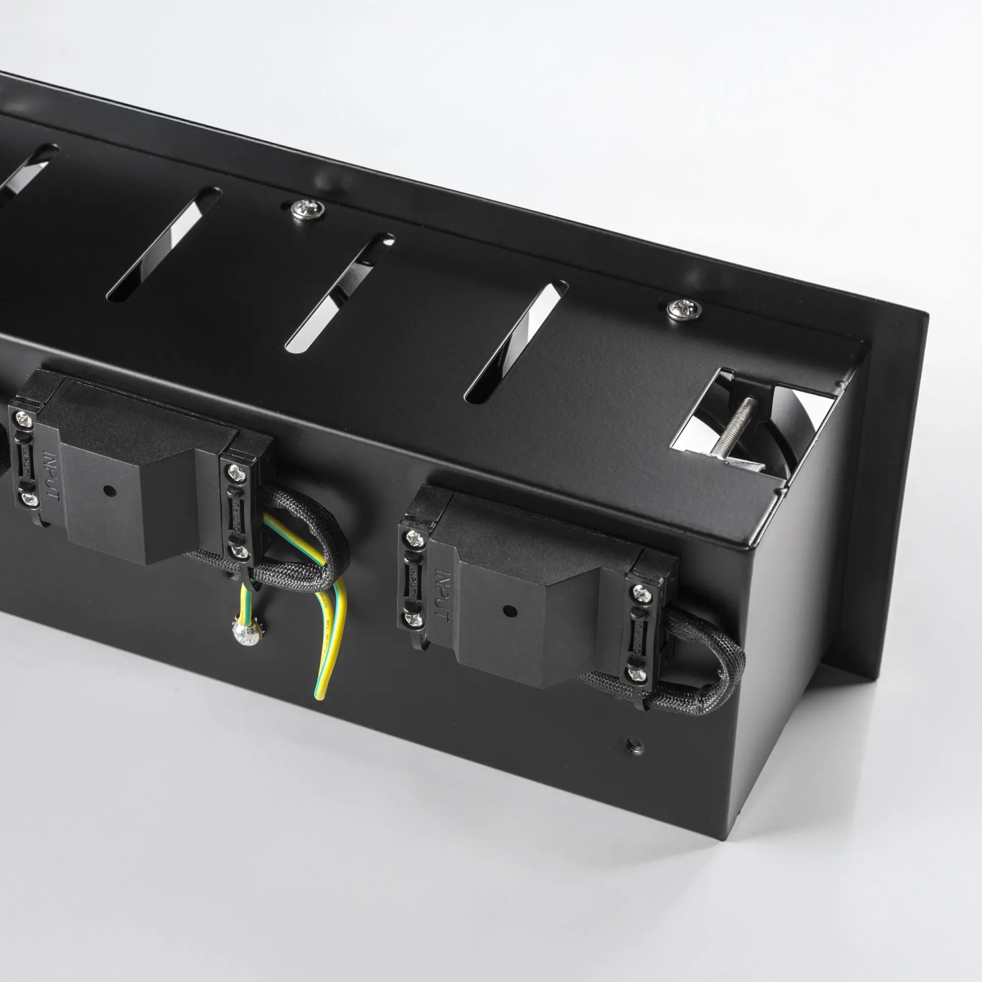 Врезное отверстие: 95x285 h100; Внешние габариты: 110x302 H5; Материал - основание/плафон: металл; Цвет-основание/плафон: черный; Лампа: 12 В MR16 max 50 Вт 2, 220 В HP16 max 50 Вт;