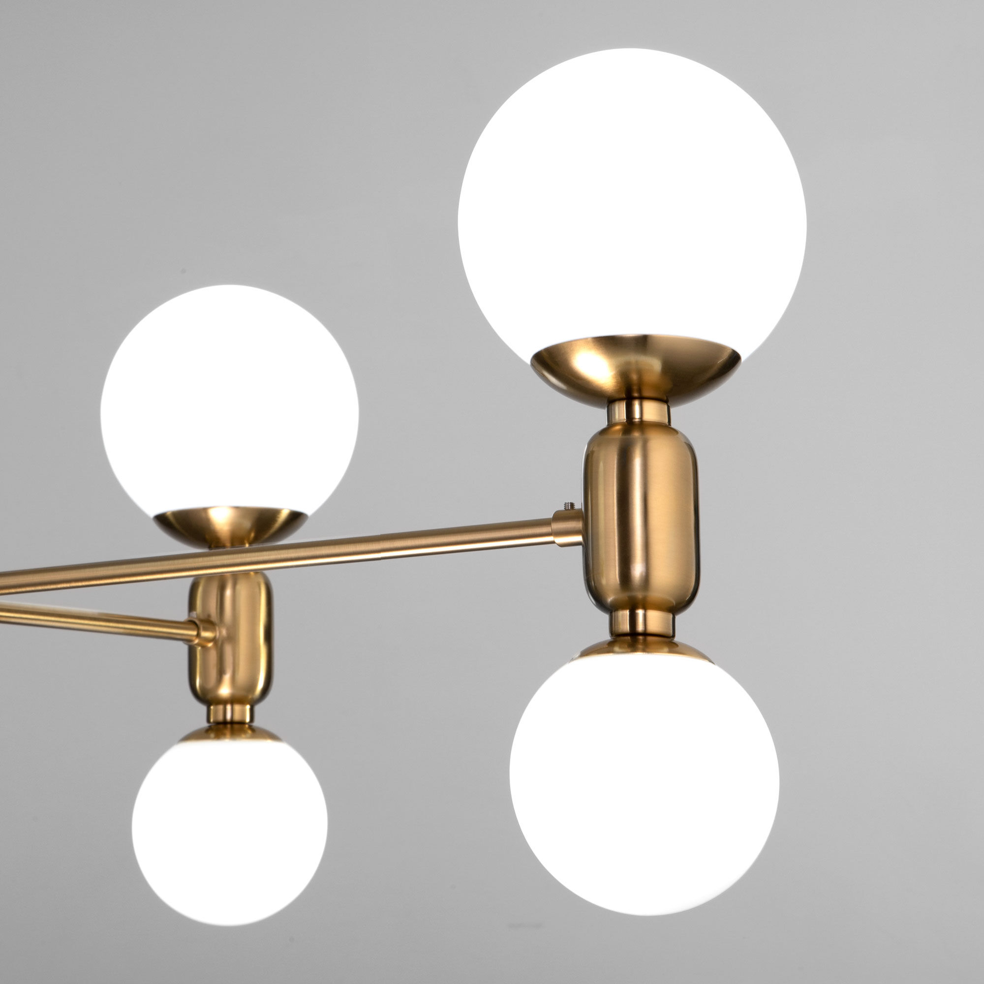 <p><strong>Подвесная люстра Bubble в цвете латунь&nbsp;</strong>&ndash; это выразительное сочетание геометрических форм и лаконичного дизайна. Круглые плафоны белого цвета разных диаметров формируют мягкий равномерный свет. Светильник рассчитан на 8 сменных ламп. Люстра Bubble добавит уникальную атмосферу в интерьер спальни, гостиной или кухни.</p> <ul> <li>Высота подвеса регулируется</li> <li>2 цоколя &ndash; Е27 для верхних плафонов с диаметром 150мм, G9 &ndash; для нижних с диаметром 110мм.</li> <li>Коллекция Bubble представлена в пяти разных цветах: черный жемчуг, белый, черный, золото, латунь.</li> </ul>