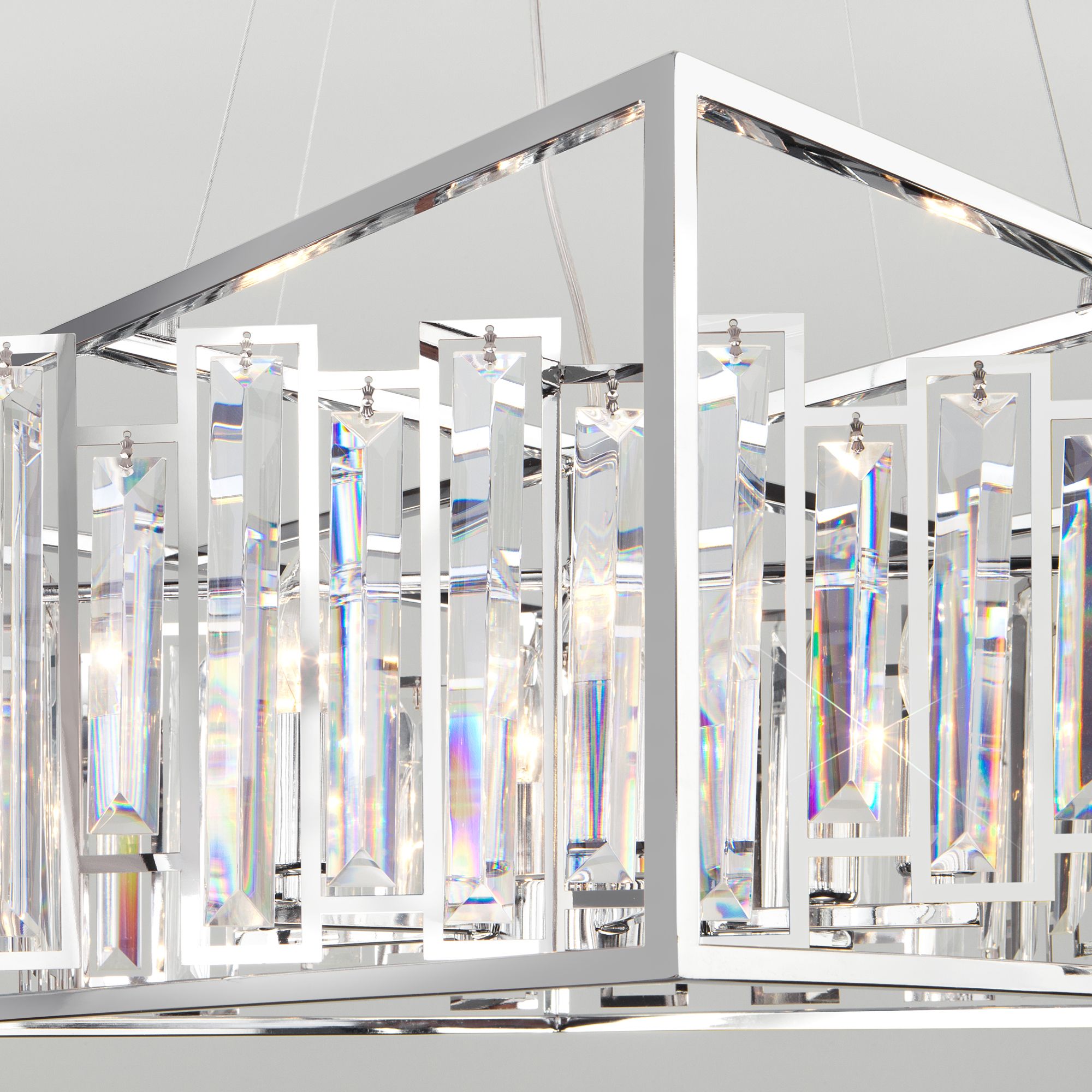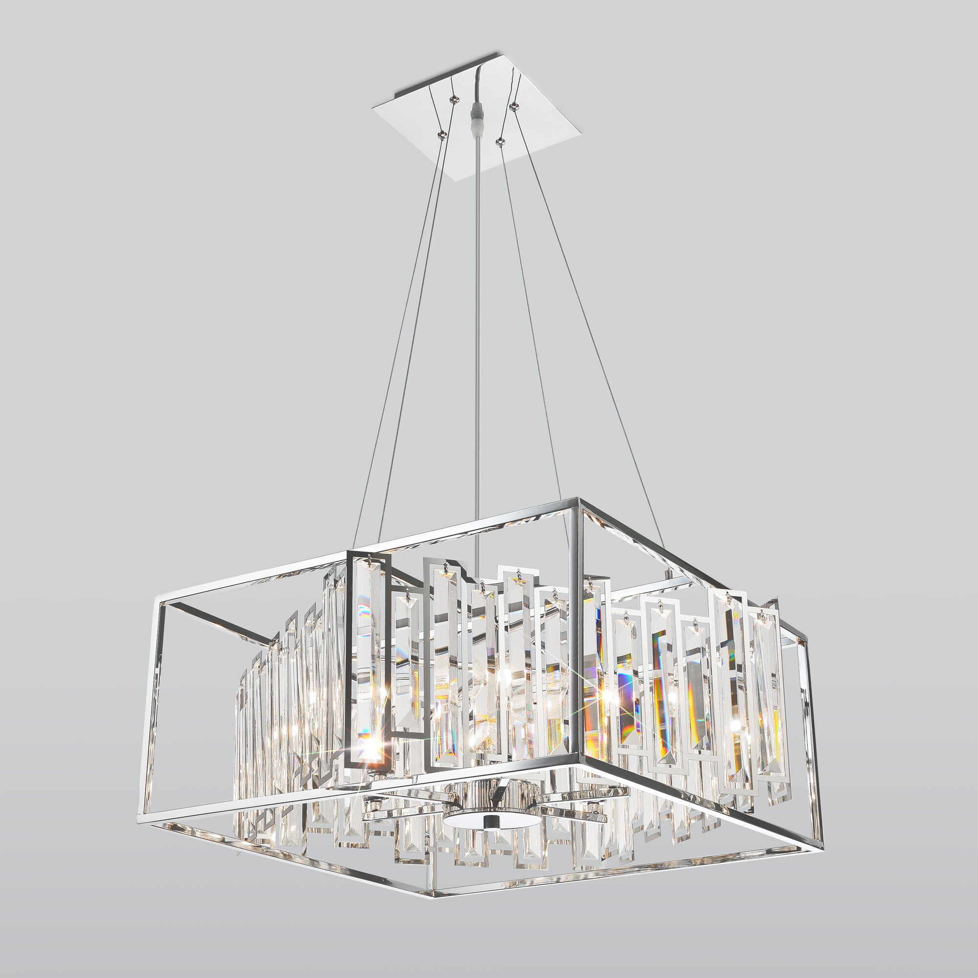 <p>Выразительная люстра с хрусталем на 6 рожков в цвете хром преобразит потолочное пространство и создаст в вашем помещении полноценное освещение на площади 24 м кв. Декоративные хрустальные пластины, украшенные сменными лампами с цоколем E14 типа свеча переливаются на свету искристыми завораживающими бликами.</p> <p>В производстве подвесной люстры использовали хрусталь с эффектной огранкой и высококачественный металл с надежным защитным покрытием.</p>