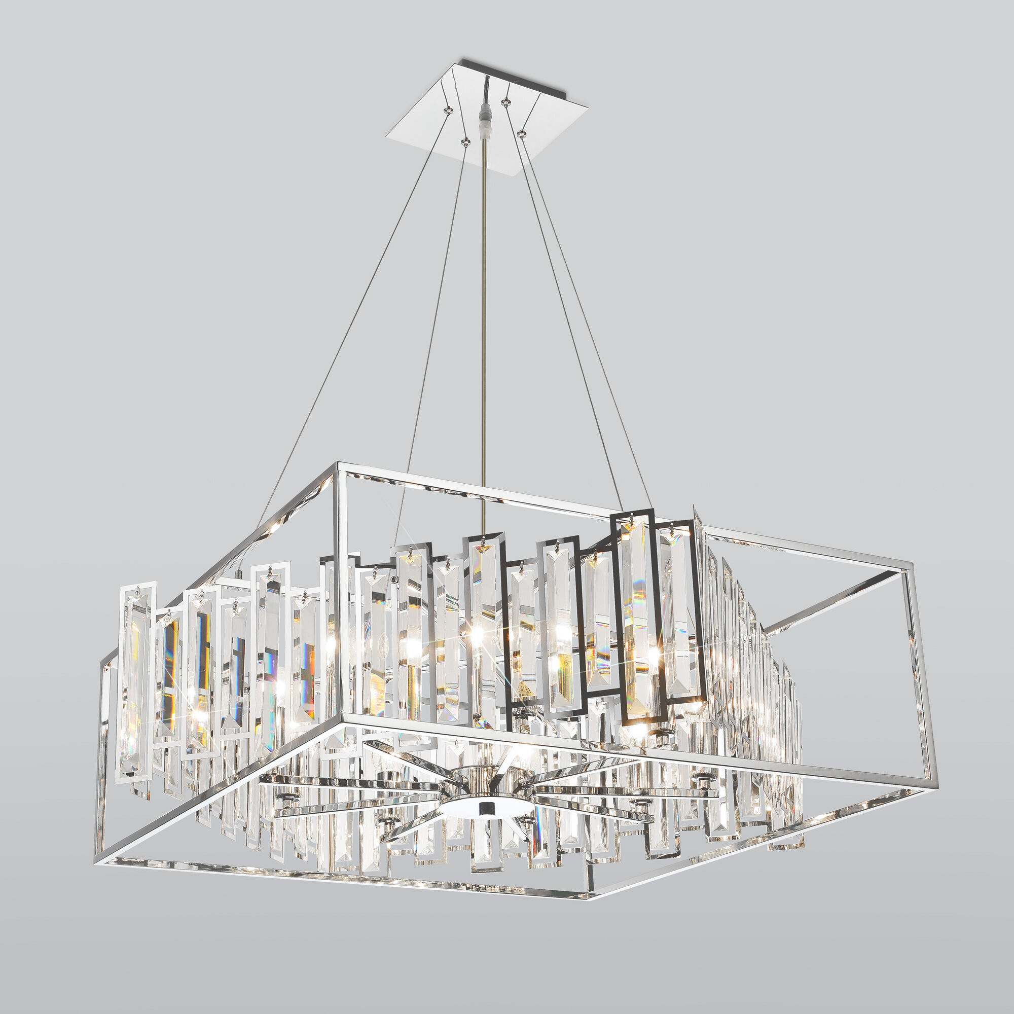 <p>Выразительная люстра с хрусталем на 9 рожков в цвете хром преобразит потолочное пространство и создаст в вашем помещении полноценное освещение на площади 36 м кв.</p> <p>Декоративные хрустальные пластины, украшенные сменными лампами с цоколем E14 типа свеча переливаются на свету искристыми завораживающими бликами. В производстве подвесной люстры использовали хрусталь с эффектной огранкой и высококачественный металл с надежным защитным покрытием.</p>