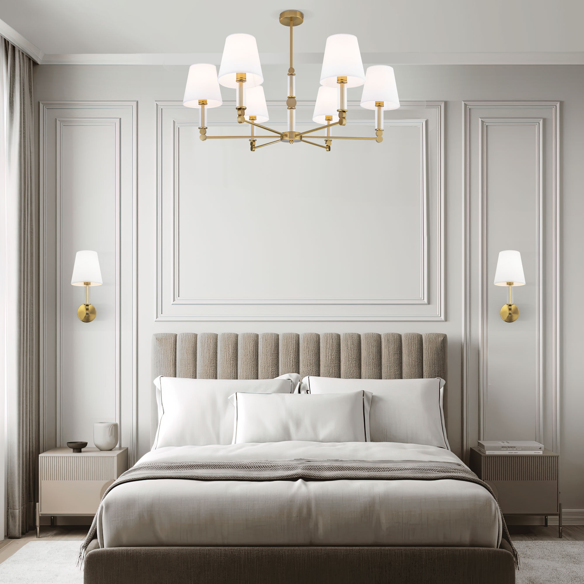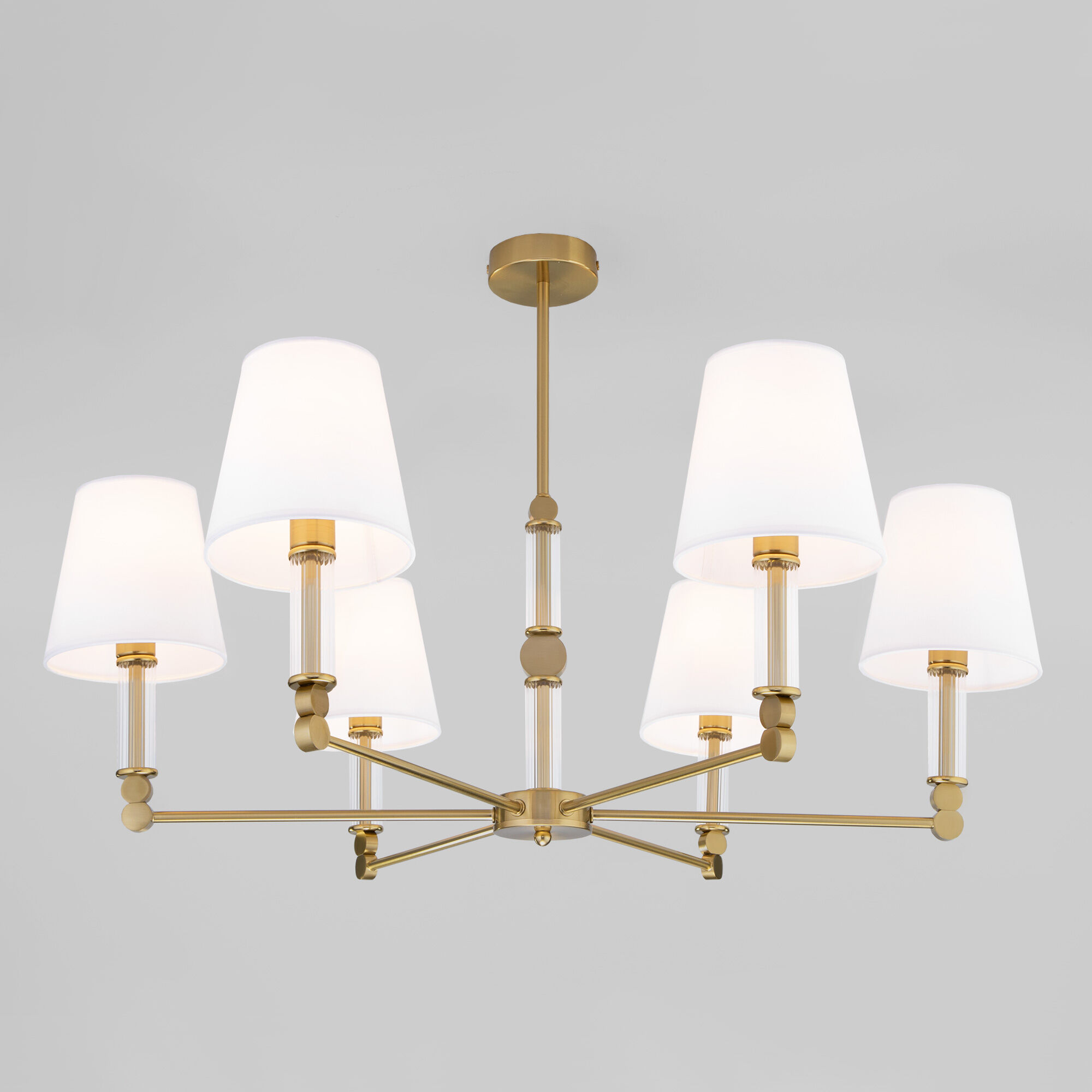 <p>Элегантная люстра Conso соединяет в себе изысканный прованс и аристократичность. В дизайне потолочного светильника использованы шесть изящных тканевых абажуров, дающих мягкое рассеянное свечение, и утонченный декор арматуры цвета латунь. Основания плафонов украшают вставки из прозрачного стекла. В модели используются сменные лампы с цоколем E14. Классический потолочный светильник Conso не только наполнит пространство светом, но добавит в интерьер умеренную торжественность.</p>