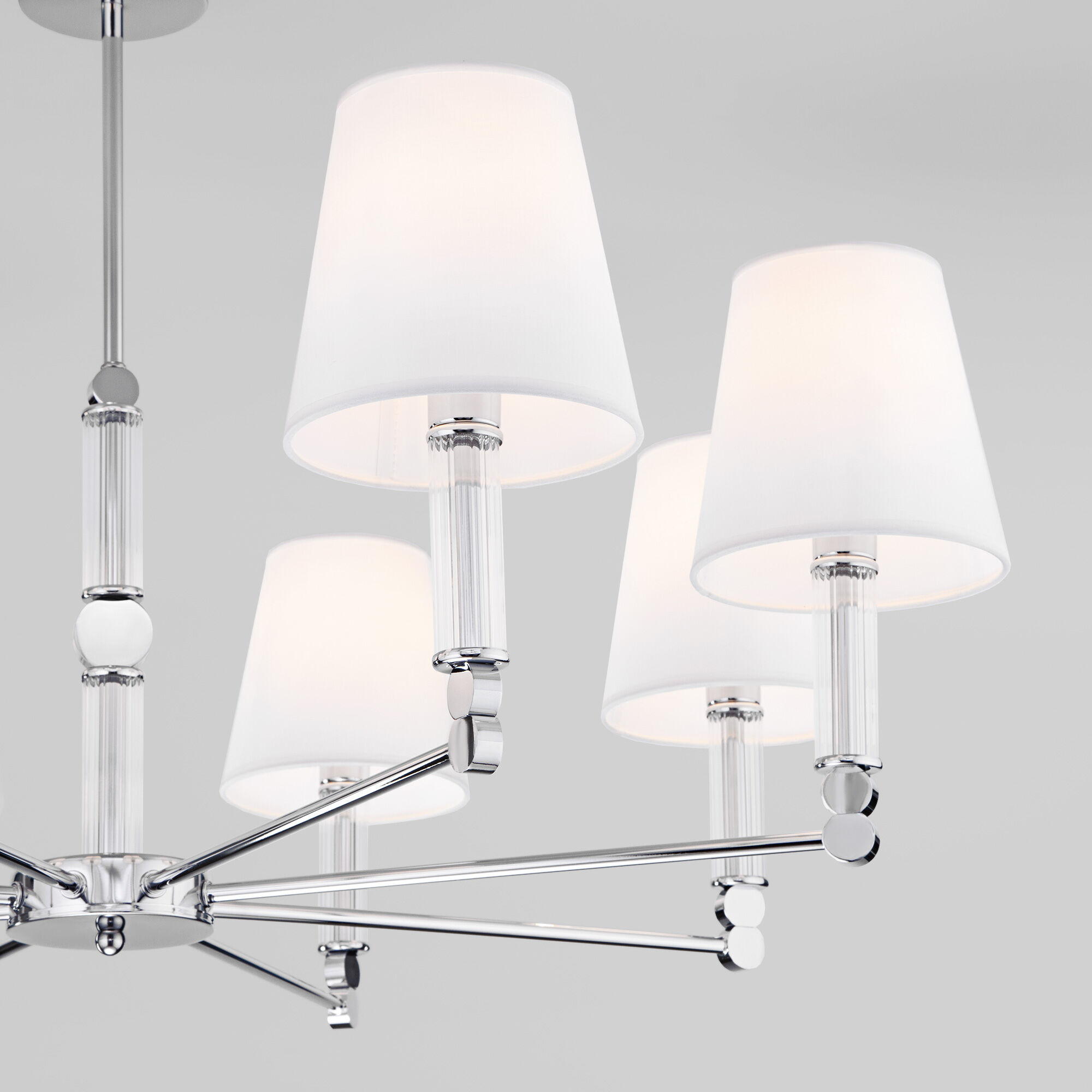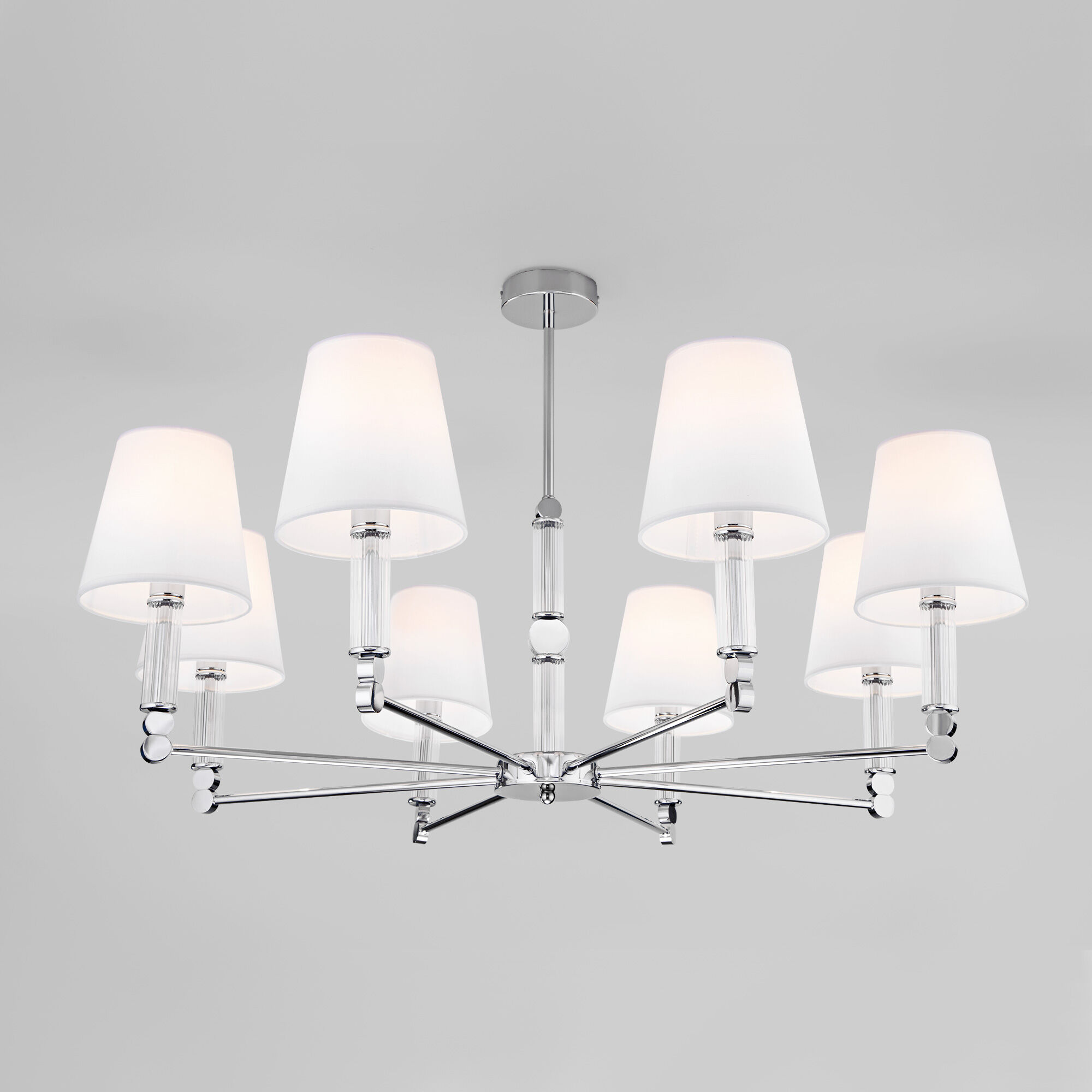 <p>Элегантная люстра Conso соединяет в себе изысканный прованс и аристократичность. В дизайне потолочного светильника использованы восемь изящных тканевых абажуров, дающих мягкое рассеянное свечение, и утонченный декор арматуры цвета хром. Основания плафонов украшают вставки из прозрачного стекла. В модели используются сменные лампы с цоколем E14. Классический потолочный светильник Conso не только наполнит пространство светом, но добавит в интерьер умеренную торжественность.</p>