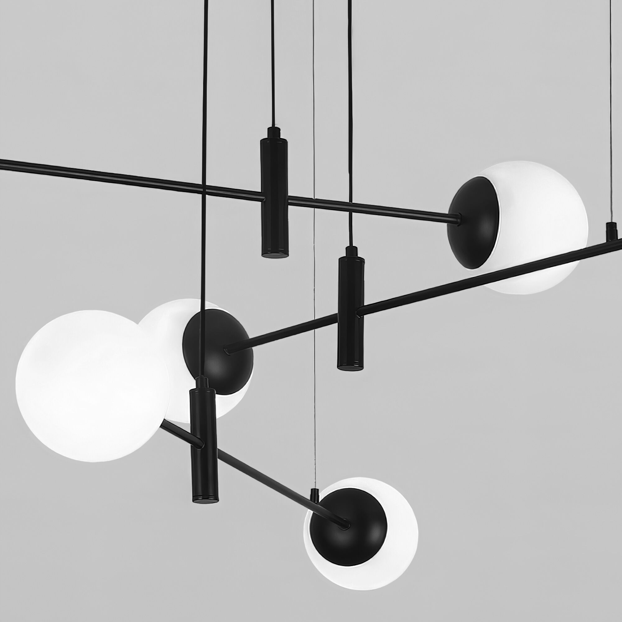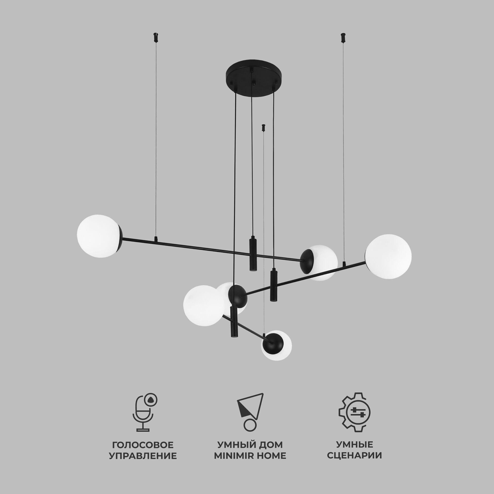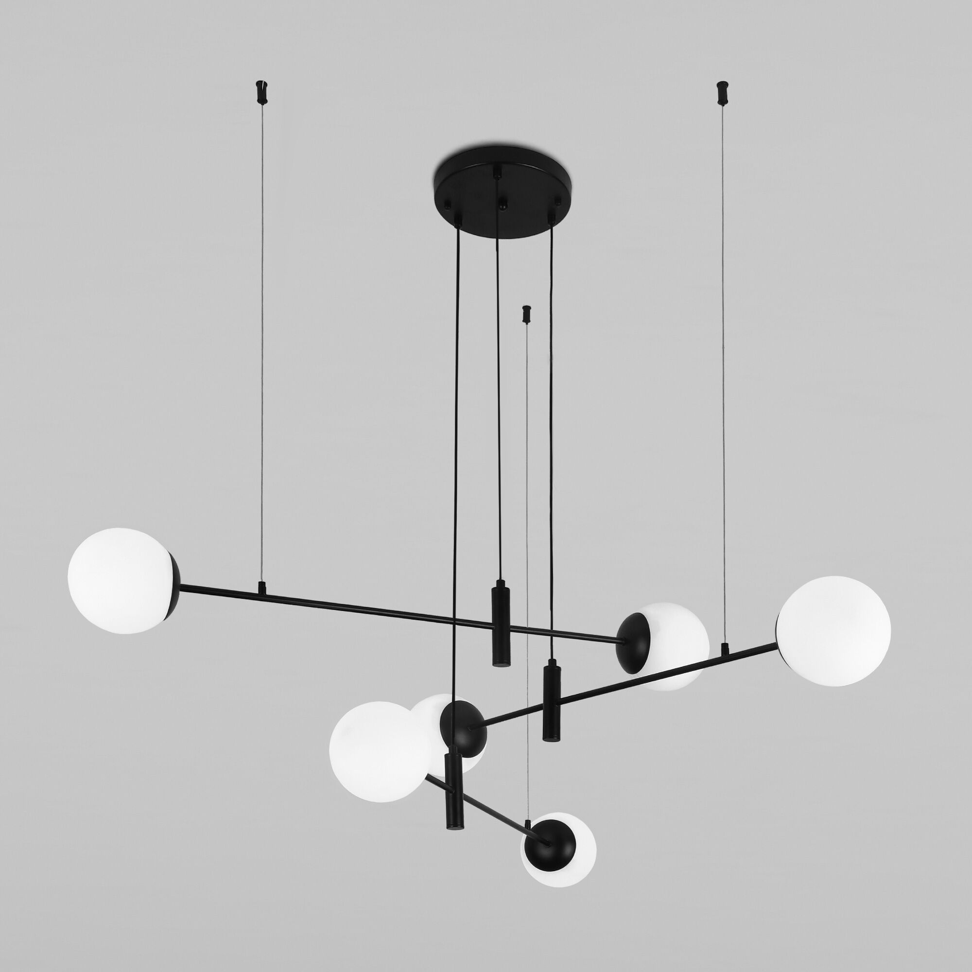<p>Подвесная люстра Planet вдохновлена хаотичным расположением планет в космосе и строгой геометрией форм. Открытая конструкция на тонких подвесах будто парит в воздухе, создавая ощущение невесомости и динамики элементов. Шесть белых матовых плафонов в форме шара мягко рассевают свет.</p> <p>Светильник Planet в черном цвете станет отличным решением для современного интерьера спальни, гостиной, кухни или кабинета. В модели используются сменные лампы с цоколем E27 и &Oslash; 45 мм.</p>