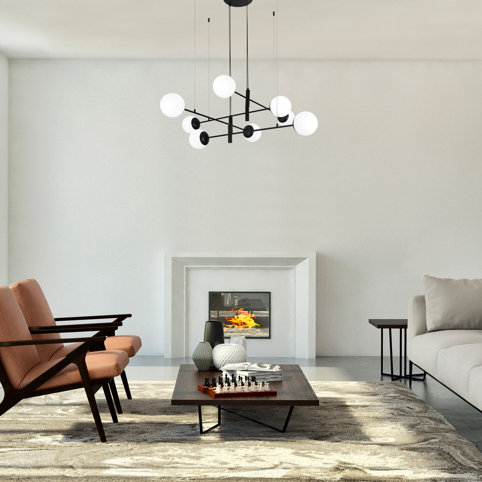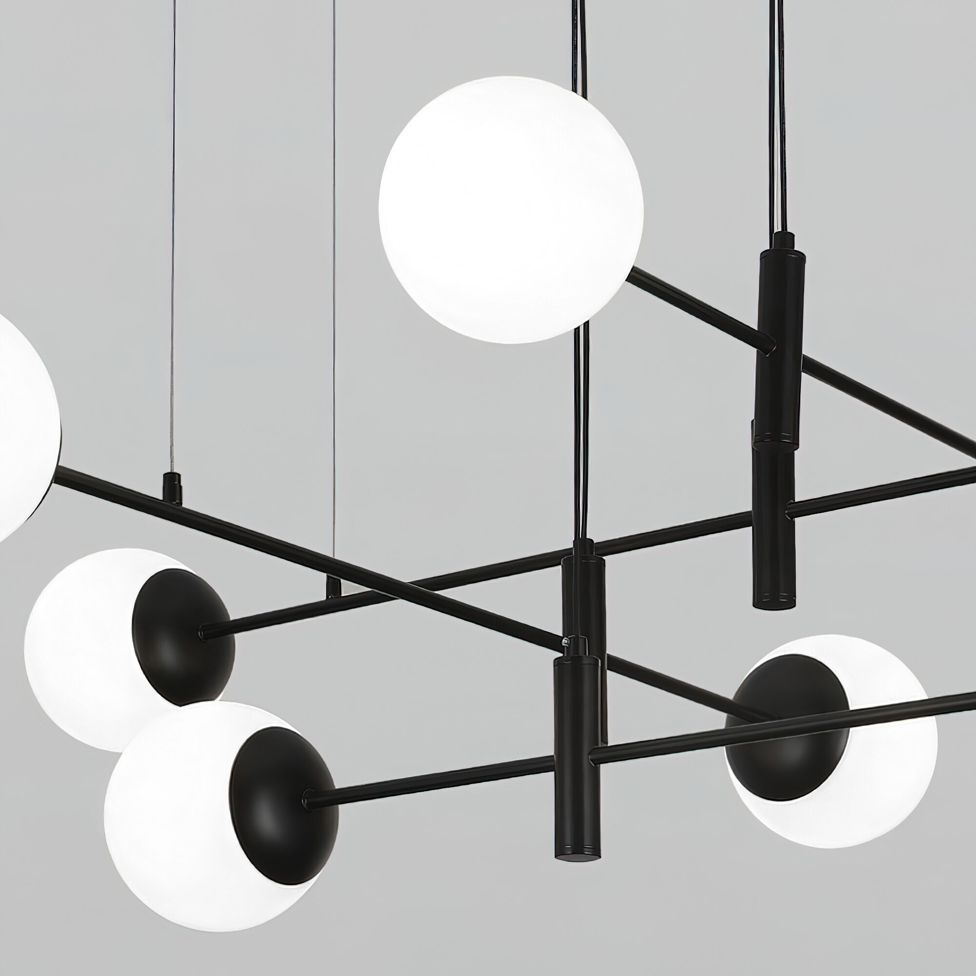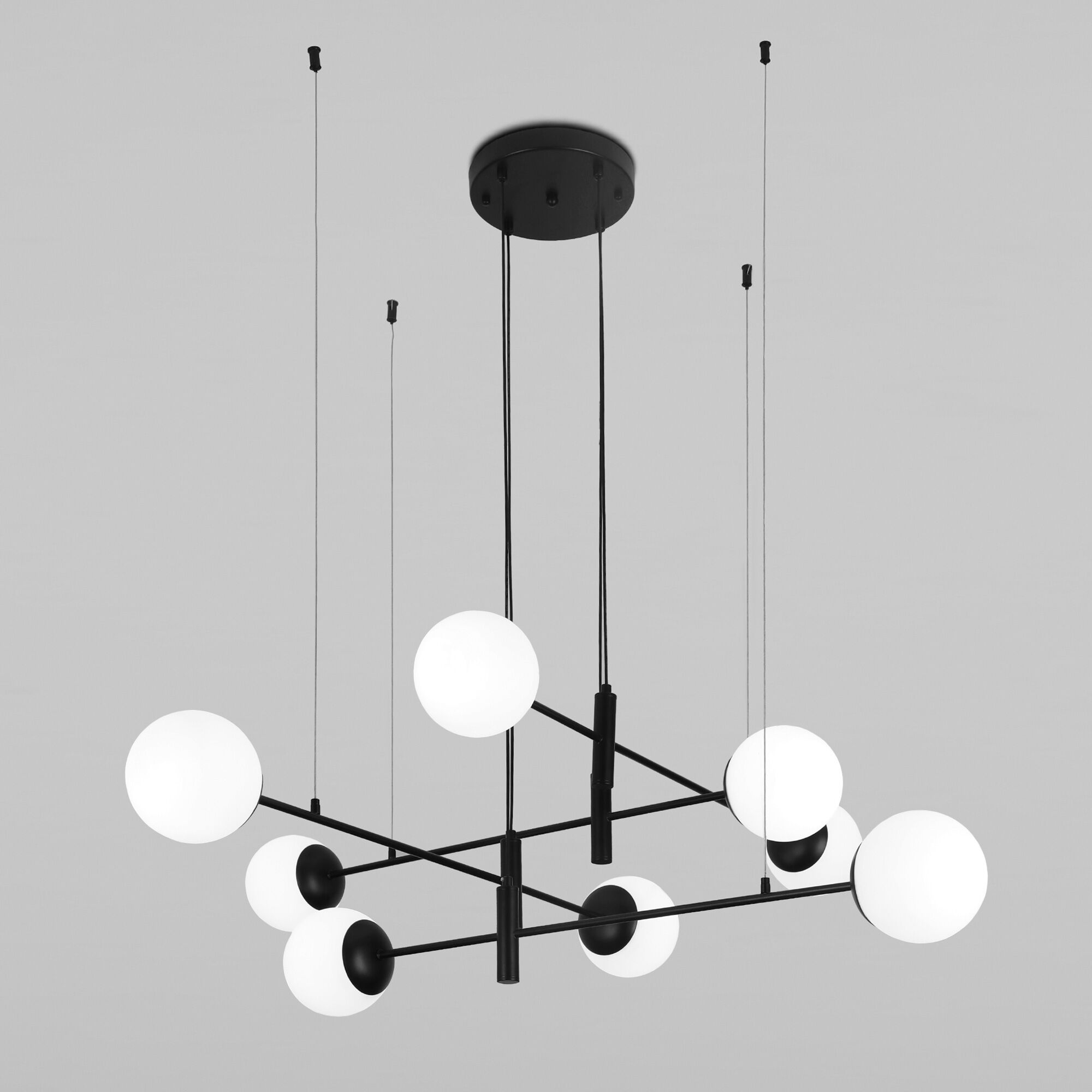 <p>Подвесная люстра Planet вдохновлена хаотичным расположением планет в космосе и строгой геометрией форм. Открытая конструкция на тонких подвесах будто парит в воздухе, создавая ощущение невесомости и динамики элементов. Восемь белых матовых плафонов в форме шара мягко рассевают свет.</p> <p>Светильник Planet в черном цвете станет отличным решением для современного интерьера спальни, гостиной, кухни или кабинета. В модели используются сменные лампы с цоколем E27 и &Oslash; 45 мм. &nbsp;</p>