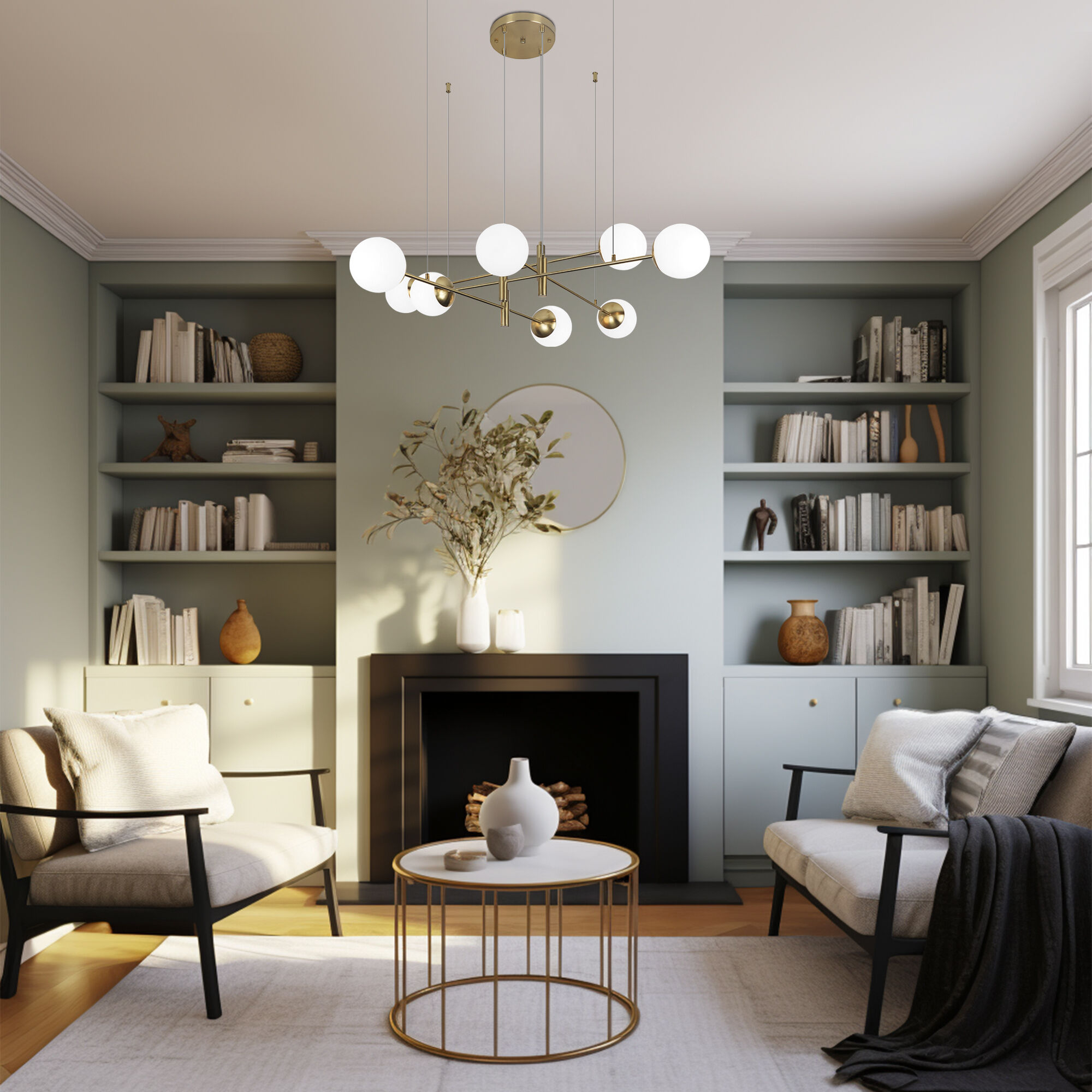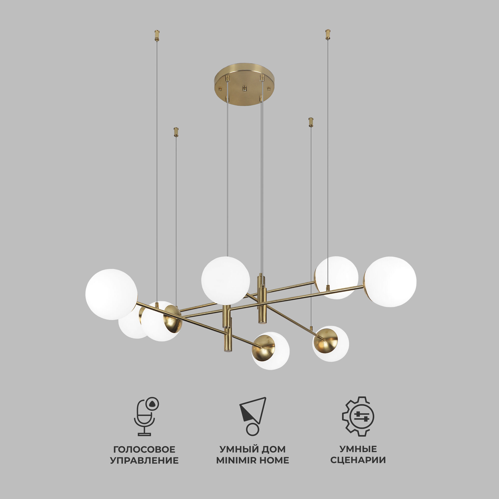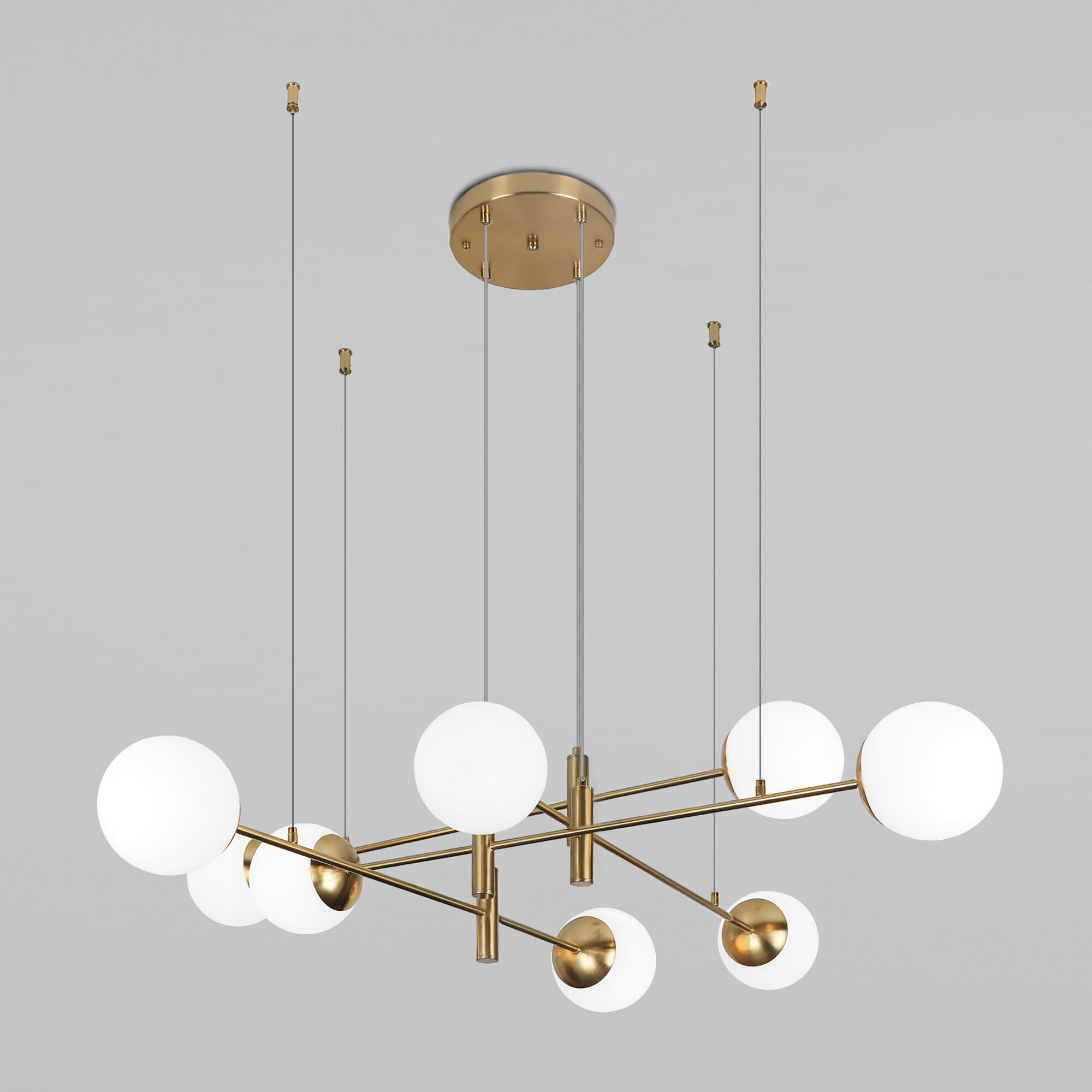 <p>Подвесная люстра Planet вдохновлена хаотичным расположением планет в космосе и строгой геометрией форм. Открытая конструкция на тонких подвесах будто парит в воздухе, создавая ощущение невесомости и динамики элементов. Восемь белых матовых плафонов в форме шара мягко рассевают свет.</p> <p>Светильник Planet в цвете латунь станет отличным решением для современного интерьера спальни, гостиной, кухни или кабинета. В модели используются сменные лампы с цоколем E27 и &Oslash; 45 мм. &nbsp;</p>