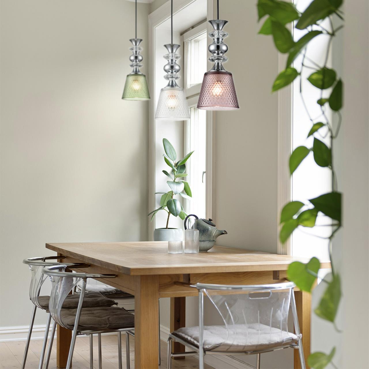 Серия соло-подвесов MANOLA подходит для помещений в классическом стиле. Сложное наборное основание из прозрачных и хромовых элементов украшает светильник. Цветное стекло плафона имеет гладкую наружную поверхность и ребристую внутри. Актуальная цветовая гамма - зеленый, розовый, прозрачный - позволяет добавить цветового акцента в интерьер.