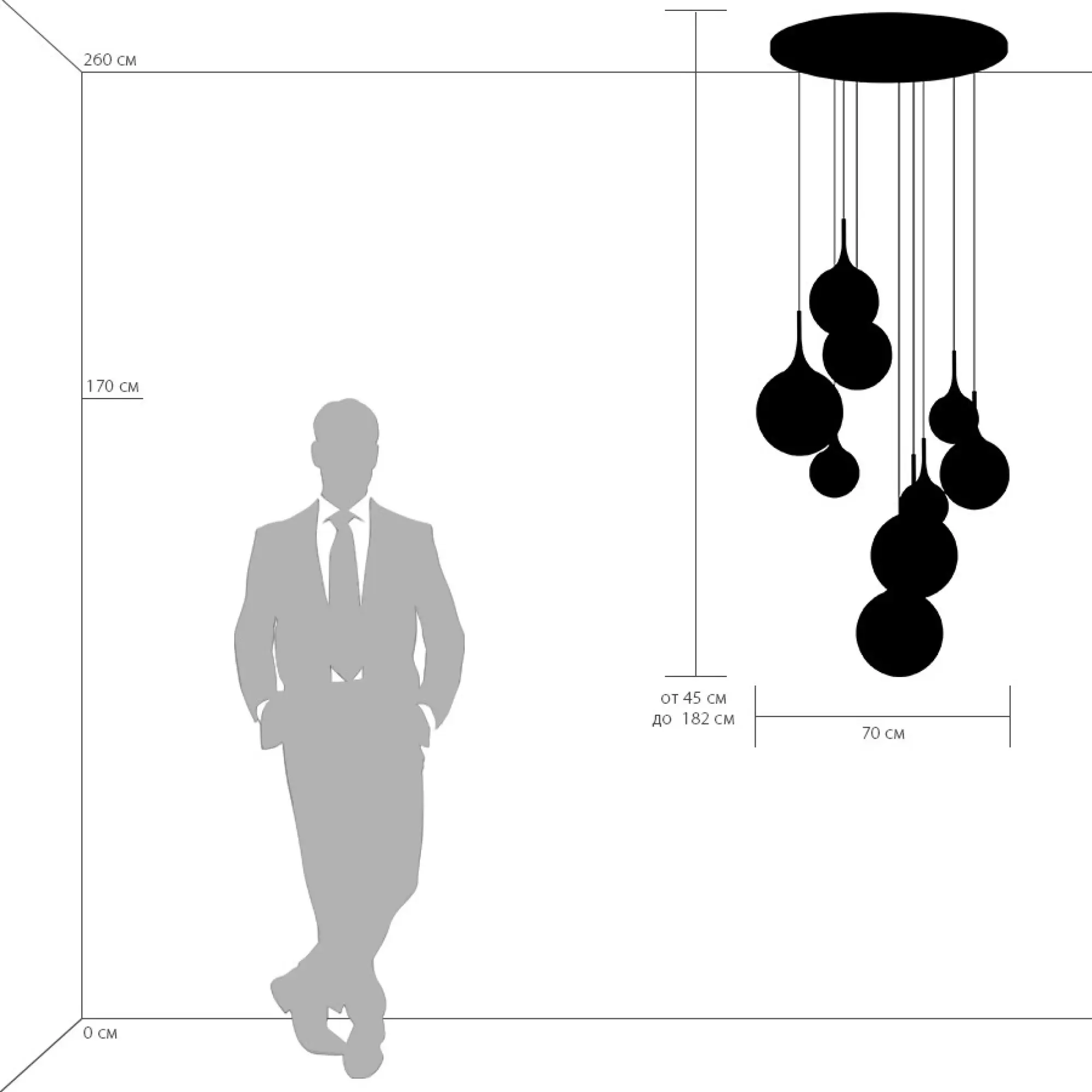 Высота min-max (см): 45-182; Ширина (см): 70; Вес (кг): 11; Кол-во ламп: 9хE14; Мощность max (W):40; Цвет основания/цвет стекла или абажура: шампань/белый;