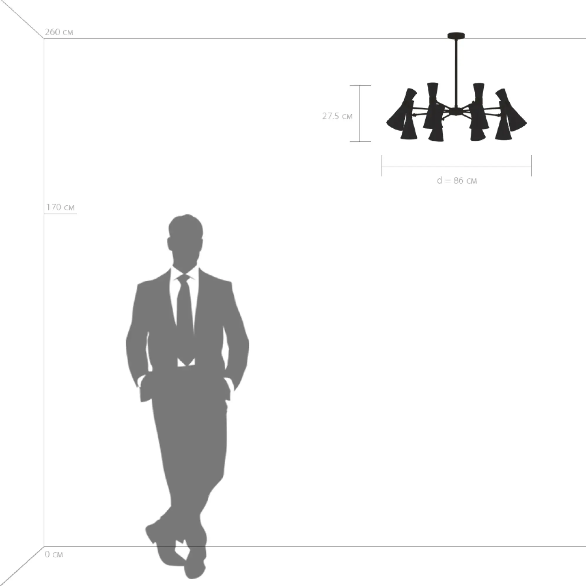 Высота min-max (см): 41-102; Ширина (см): 86; Вес (кг): 4,4; Кол-во ламп: 8хE14; Мощность max (W): 40; Цвет основания/цвет стекла или абажура: Матовый белый/золото;