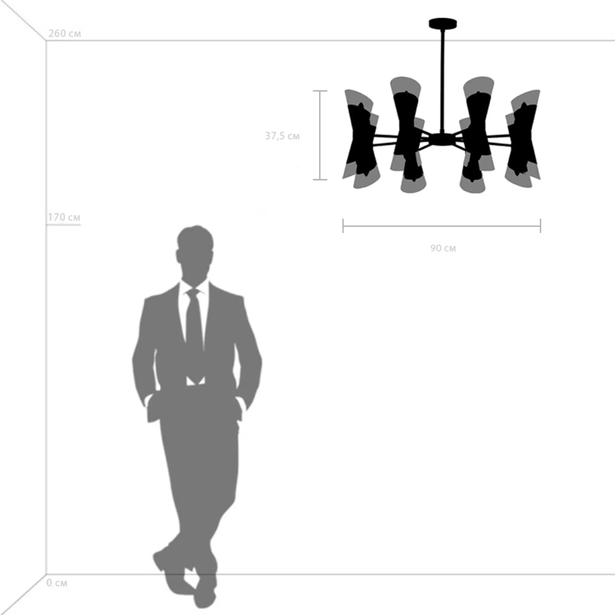 Высота min-max (см): 37,5-133,5; Ширина (см): 90; Вес (кг): 10,9; Кол-во ламп: 16хE14; Мощность max (W): 40; Цвет основания/цвет стекла или абажура: Хром;