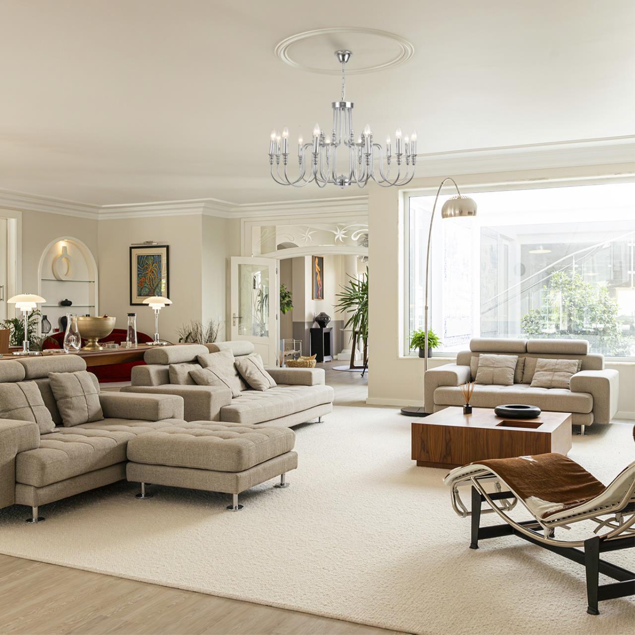 Простая на первый взгляд линия SUANA является ярким представителем стиля ар-деко. Множество повторяющихся изогнутых линий, блеск металла и внушительные размеры делают эту линию привлекательной яркой и заметной в интерьере. При этом тонкая арматура и изящные подсвечники добавляют всей конструкции легкости и элегантности.