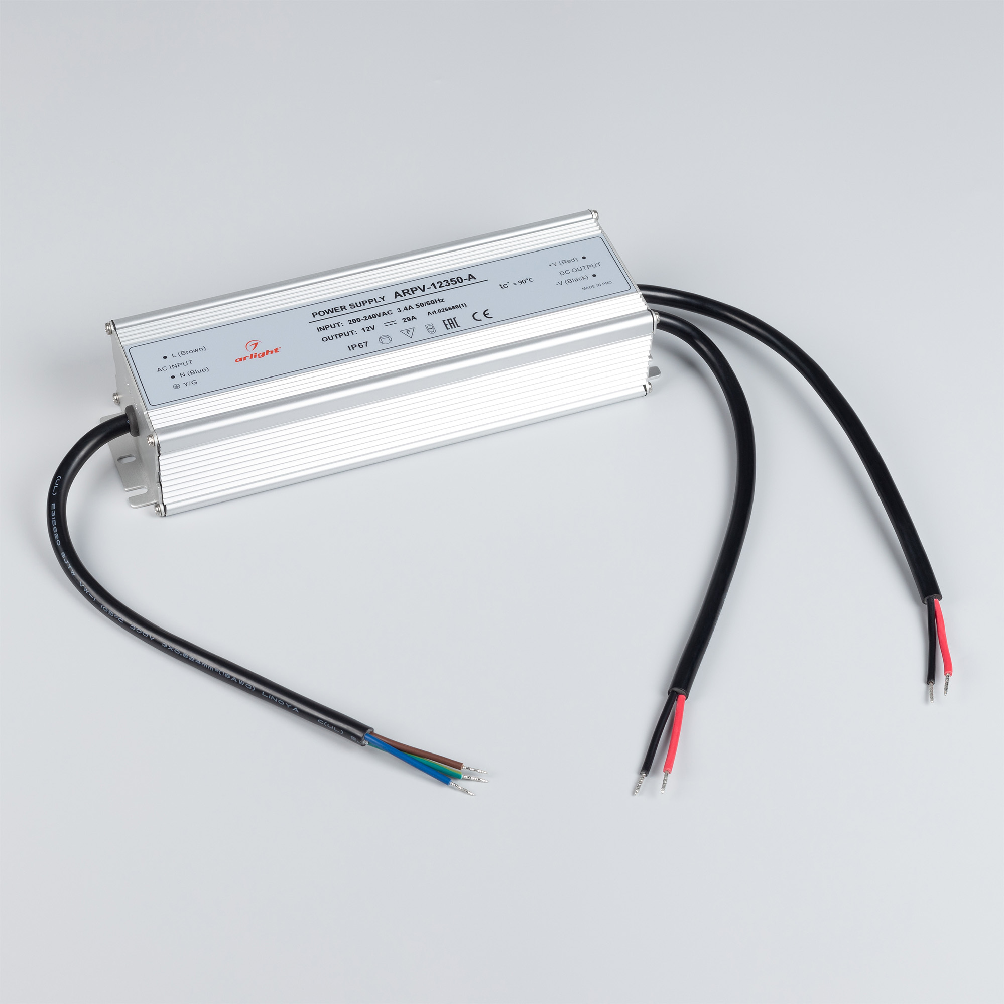 Источник напряжения с гальванической развязкой для светодиодных изделий. Входное напряжение 200-240 VAC. Выходные параметры: 12 В, 29 А, 350 Вт. Встроенный PFC >0,5. Герметичный алюминиевый корпус IP 67. Рабочая температура -30…+50C⁰. Габаритные размеры длина 238 мм, ширина 74 мм, высота 46 мм. Гарантийный срок 3 года. Не допускается использовать источник питания совместно с диммерами (регуляторами освещения), как по входу, так и по выходу источника питания!