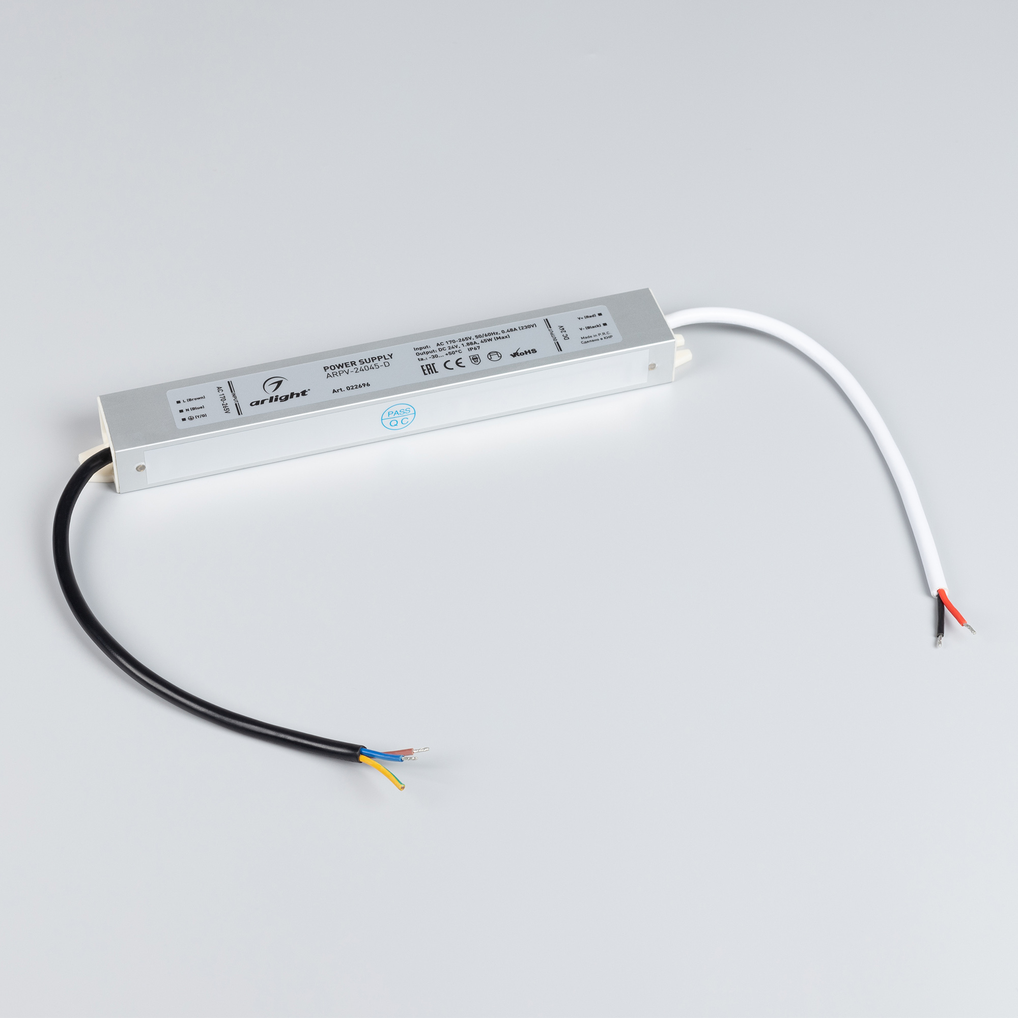 Источник напряжения с гальванической развязкой для светодиодных изделий. Входное напряжение 170-265 VAC. Выходные параметры: 24 В, 1,88 А, 45 Вт. Встроенный PFC >0,5. Герметичный алюминиевый корпус IP 67. Рабочая температура -30…+50C⁰. Габаритные размеры длина 217 мм, ширина 30 мм, высота 20 мм. Гарантийный срок 3 года.