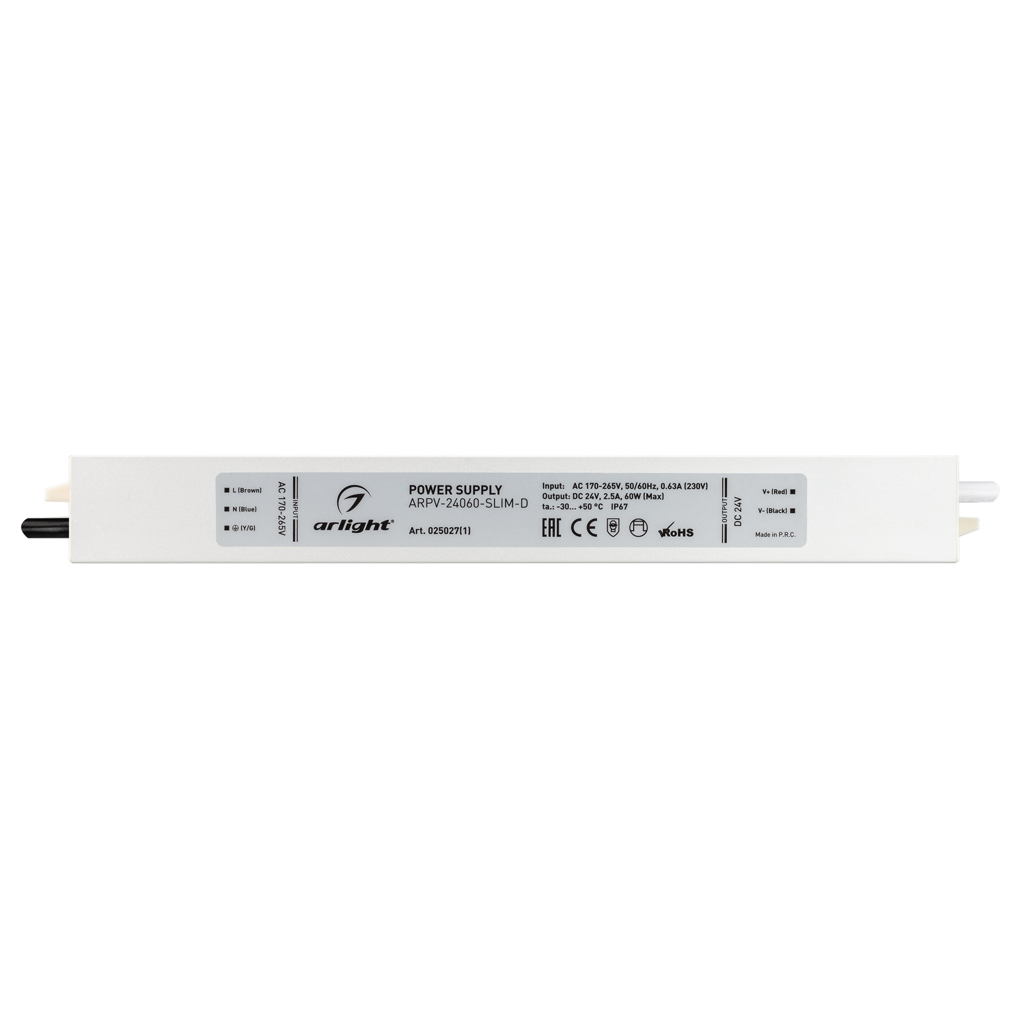 Источник напряжения с гальванической развязкой для светодиодных изделий. Входное напряжение 170-265 VAC. Выходные параметры: 24 В, 2,5 А, 60 Вт. Встроенный PFC >0,5. Герметичный алюминиевый корпус IP 67. Рабочая температура -30…+50C⁰. Габаритные размеры длина 257 мм, ширина 30 мм, высота 20 мм. Гарантийный срок 3 года.