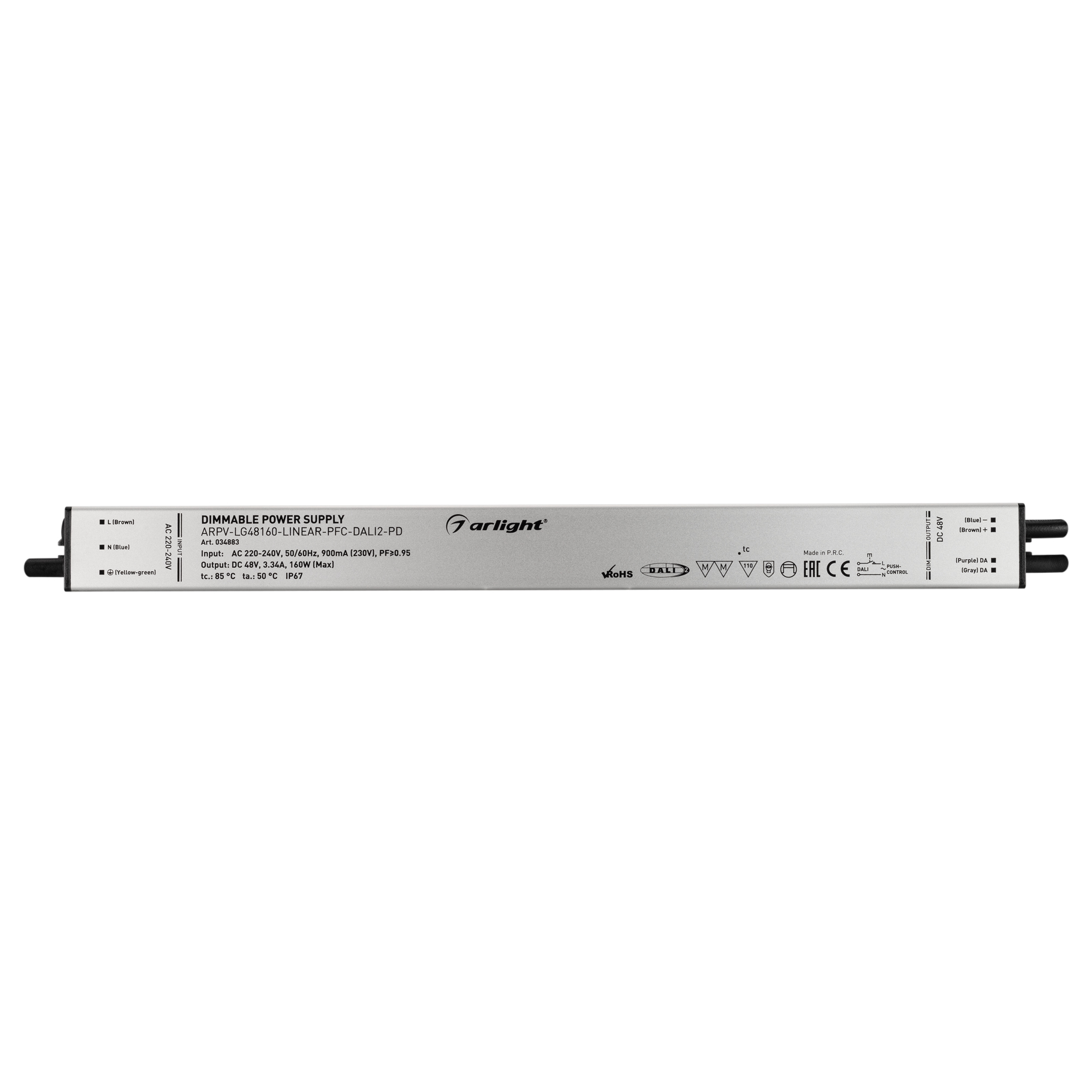 Диммируемый блок питания 48V с гальванической развязкой, ток 3.34А, 160Вт, с управлением DALI, c функцией PUSH-DIM, с корректором мощности, PF>0,95. Тонкий металлический корпус IP67. Вход: 220-240VAC. Выход: 48VDC, ШИМ 1кГц. Размер 350х30х21 mm.. Соответствует требованиям EMC. Гарантия 5 лет. Допускается использование только внутри помещений.