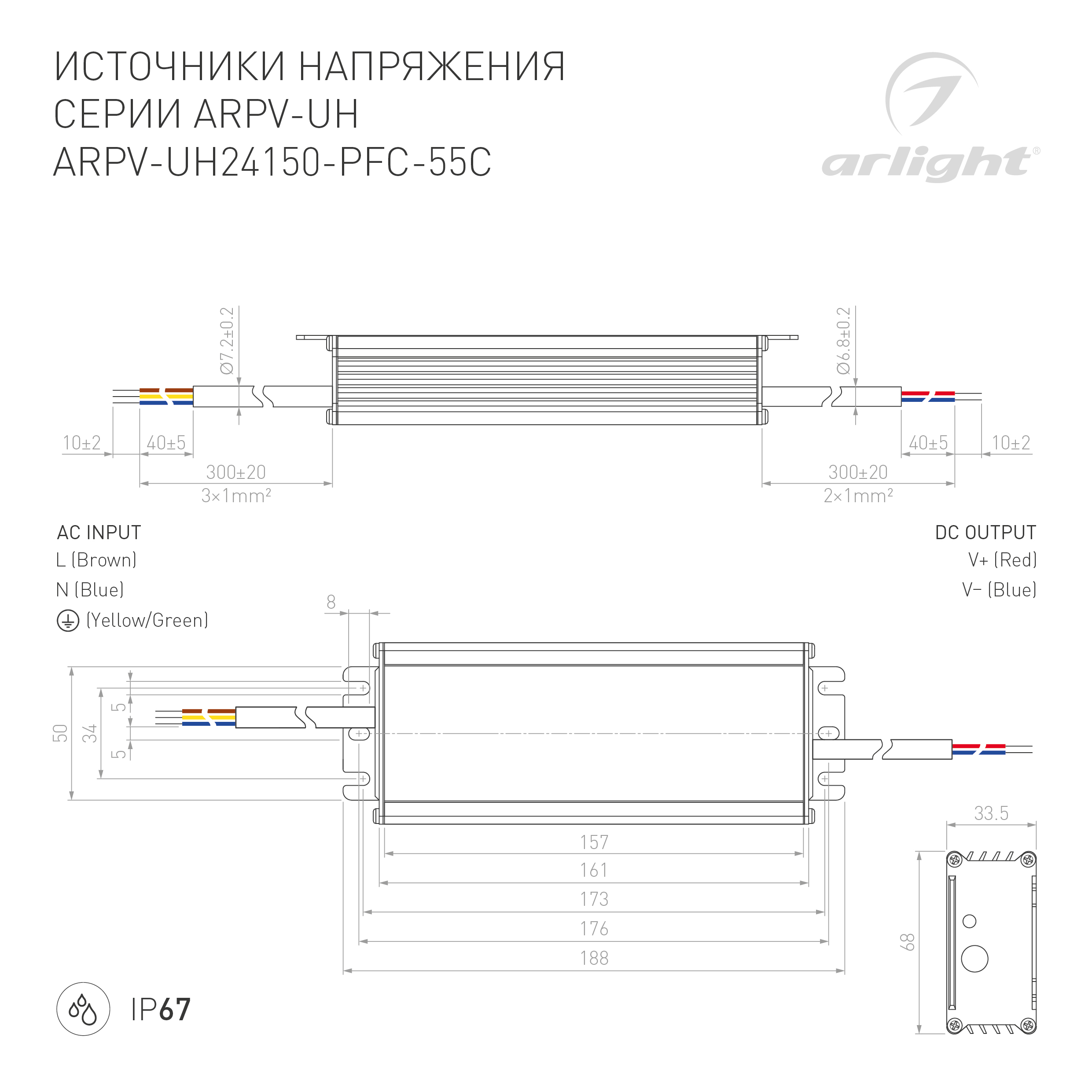 Источник напряжения с гальванической развязкой для светодиодных изделий. Предназначен для работы в условиях Крайнего Севера с запуском до -55С. Входное напряжение 120-240 VAC. Выходные параметры: 24 В, 6.3 А, 150 Вт. Встроенный PFC >0.95. Герметичный алюминиевый корпус IP 67. Рабочая температура -55…+70C⁰. Габаритные размеры длина 188 мм, ширина 67.5 мм, высота 33.5 мм. Гарантийный срок 5 лет.