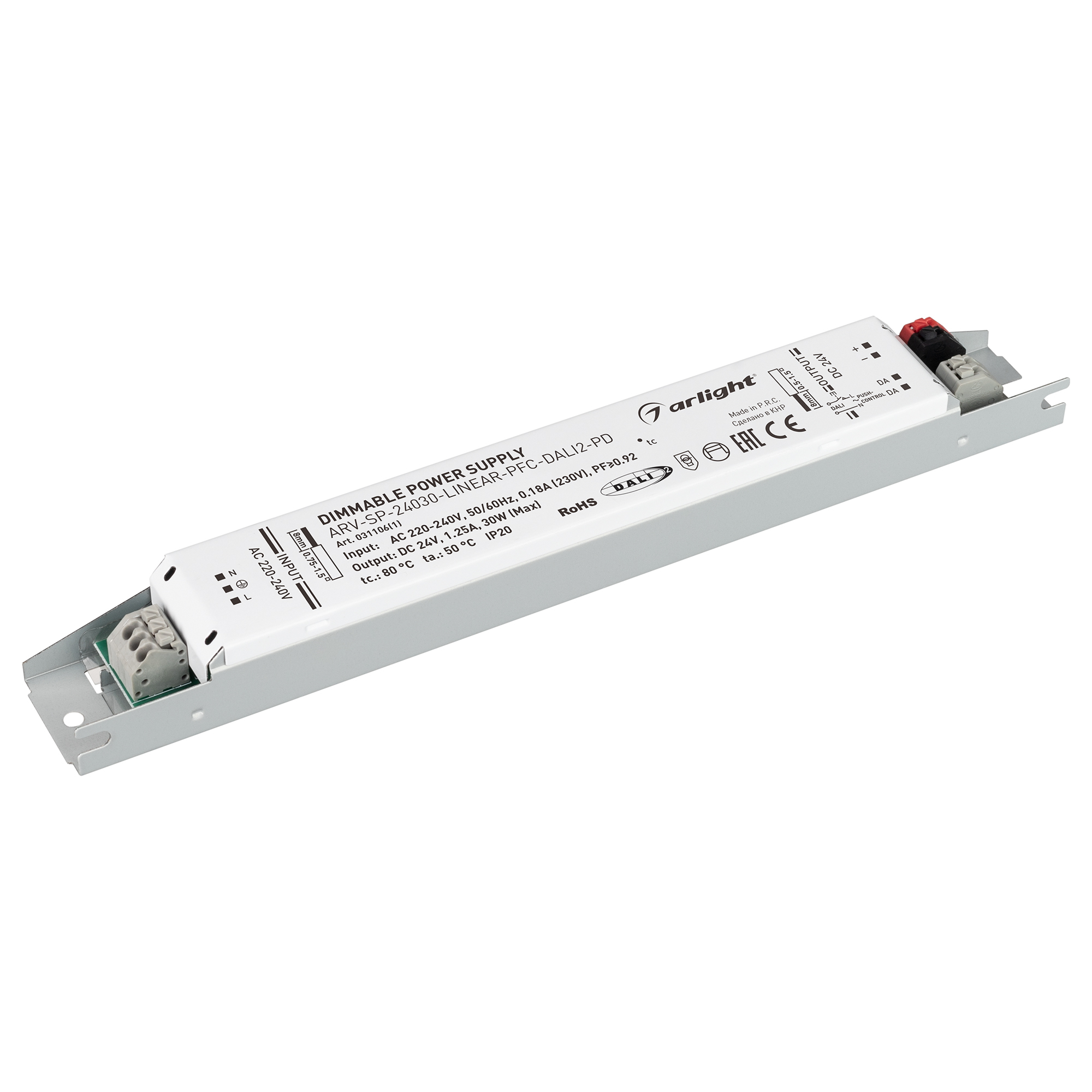 Диммируемый источник напряжения по протоколу DALI 2.0 и функцией PUSH DIM с гальванической развязкой для светодиодных изделий. Входное напряжение 220-240 VAC. Выходные параметры: 24 В, 1,25 А, 30 Вт. Встроенный PFC >0.92. Негерметичный алюминиевый корпус IP 20. Габаритные размеры длина 230 мм, ширина 30 мм, высота 21 мм. Гарантийный срок 5 лет.