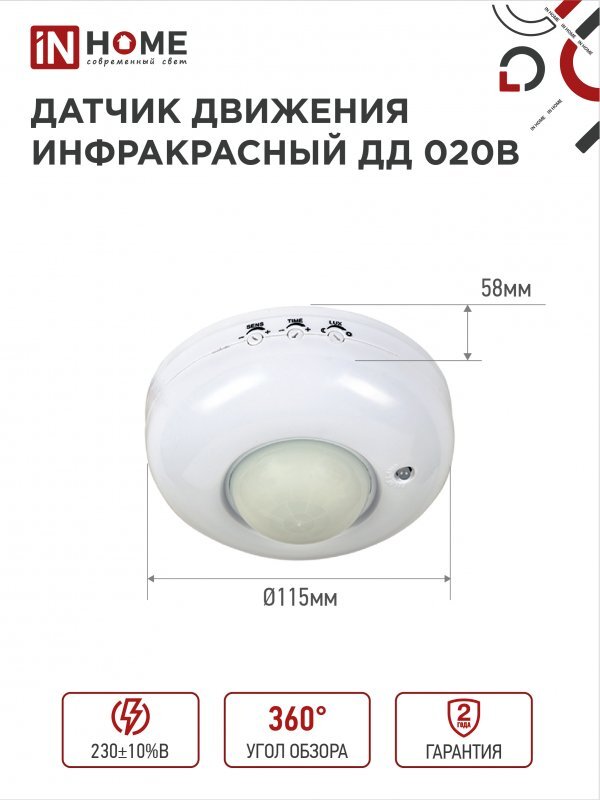 Инфракрасный датчик движения ДД 020B от ТМ INhome с углом обзора 360° и дальностью действия до 6 м используется для автоматического включения и выключения нагрузки при появлении движущихся объектов. Хорошо управляет внутренним и наружным освещением, электрическими приборами, устройствами сигнализации. Монтируется открытым способом на стену или другую ровную поверхность. Преимущества: • стильный дизайн, • легкий вес, • компактные размеры, • долговечность, • практичность, • прочность, • работа со всеми типами ламп, • экономия электричества, • настройки времени / выдержки включения / порога срабатывания.