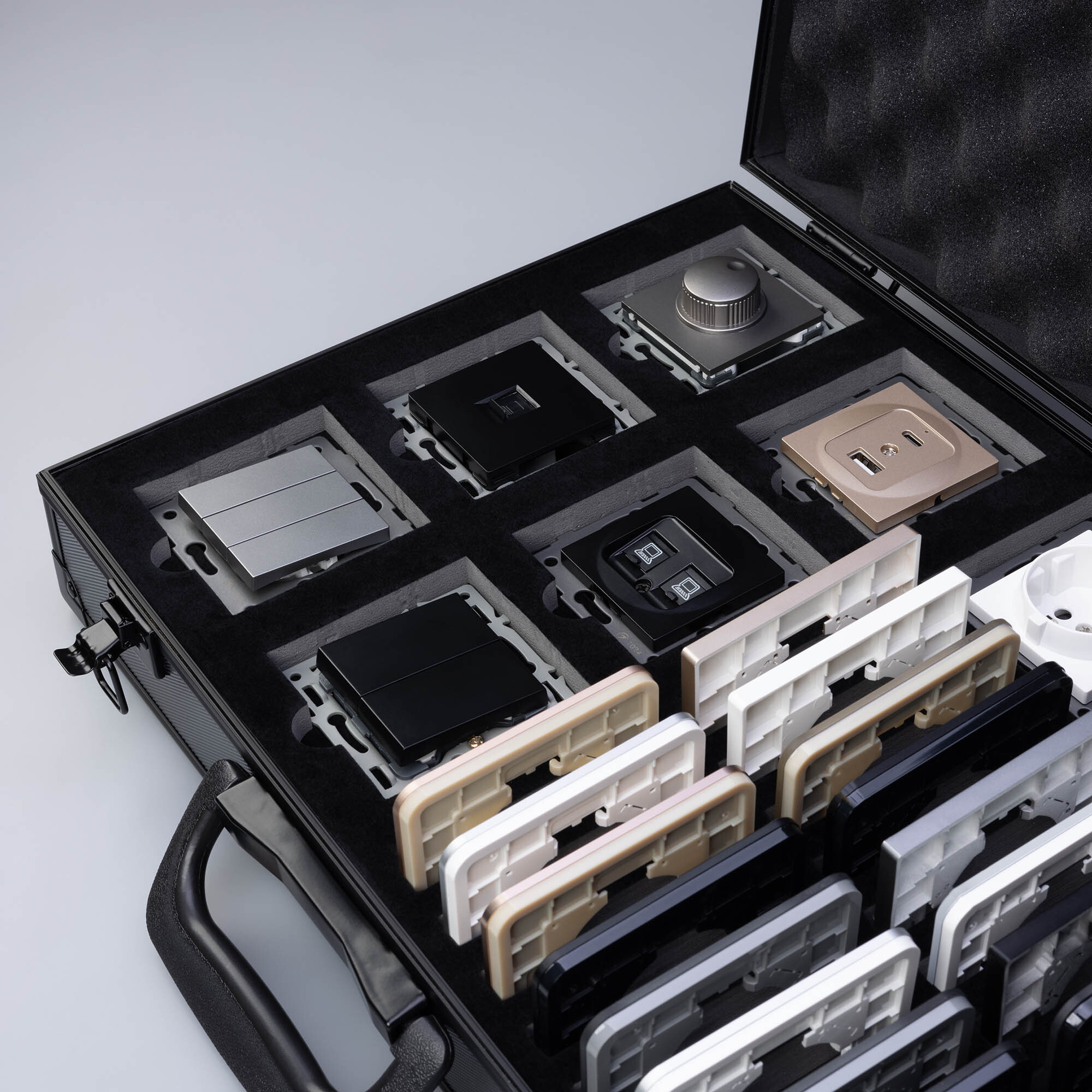Демо-кейс без наполнения для демонстрации продукции ЭУИ. Рамки и Механизмы в комплект не входят. Материал: Алюминий + вспененный полиуретан. Ячейки для размещения: 8 мест под механизмы и 16 мест под однопостовые рамки. Габаритные размеры кейса: 280*400*100мм. Размер под логотип: 260*380мм