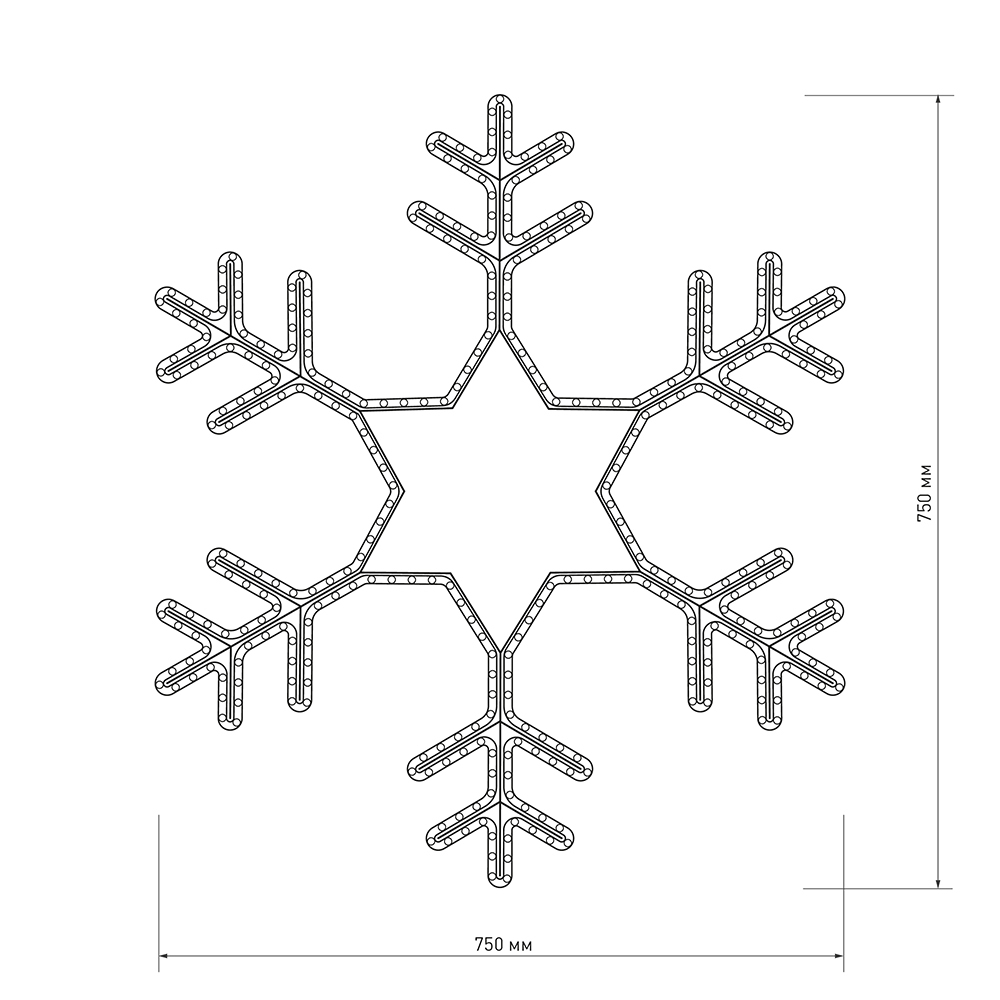 Светодиодная фигура СНЕЖИНКА. Размер 750x750 мм. Цвет светодиодов БЕЛЫЙ (6000 К), постоянное свечение. 324 светодиода. Напряжение питания 230 В, потребляемая мощность 18 Вт, степень пылевлагозащиты IP65. Фигура укомплектована проводом питания для подключения к сети 230 В (без вилки питания).
