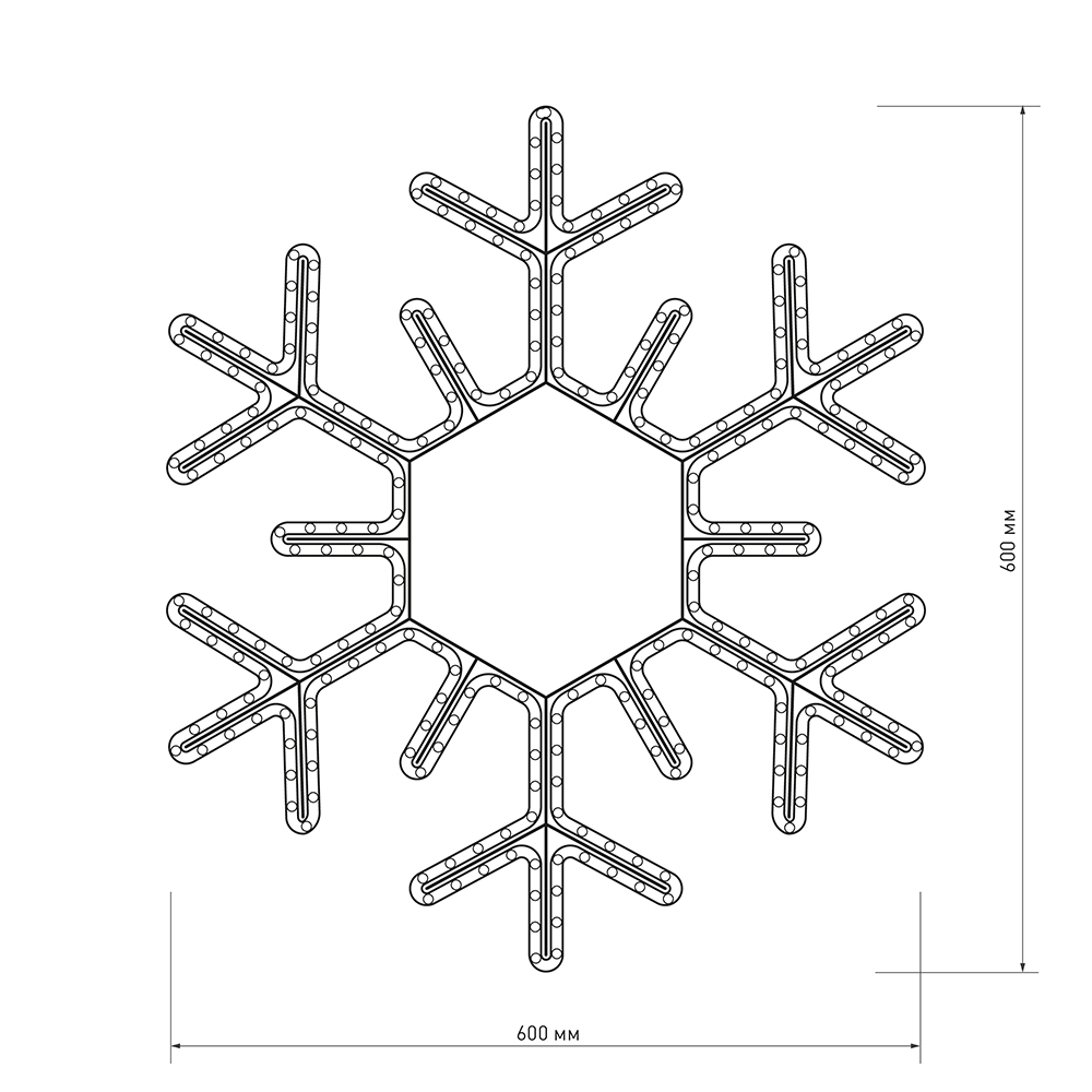 Светодиодная фигура СНЕЖИНКА. Размер 600x600 мм. Цвет светодиодов БЕЛЫЙ (6000 К), постоянное свечение. 216 светодиодов. Напряжение питания 230 В, потребляемая мощность 15 Вт, степень пылевлагозащиты IP65. Фигура укомплектована проводом питания для подключения к сети 230 В (без вилки питания).