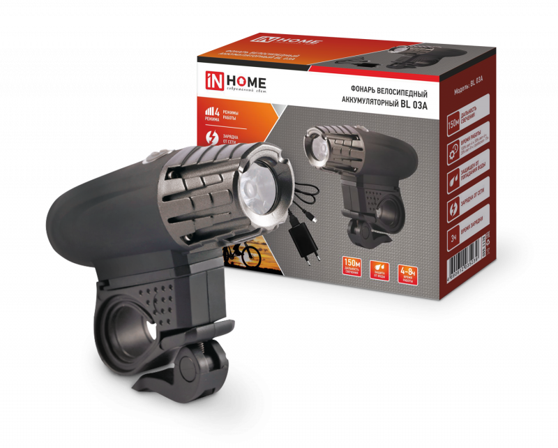 Фонарь аккумуляторный велосипедный BL 03А LED 3Вт 300лм 4 режима с ЗУ 220В черн. IN HOME 4690612035239
