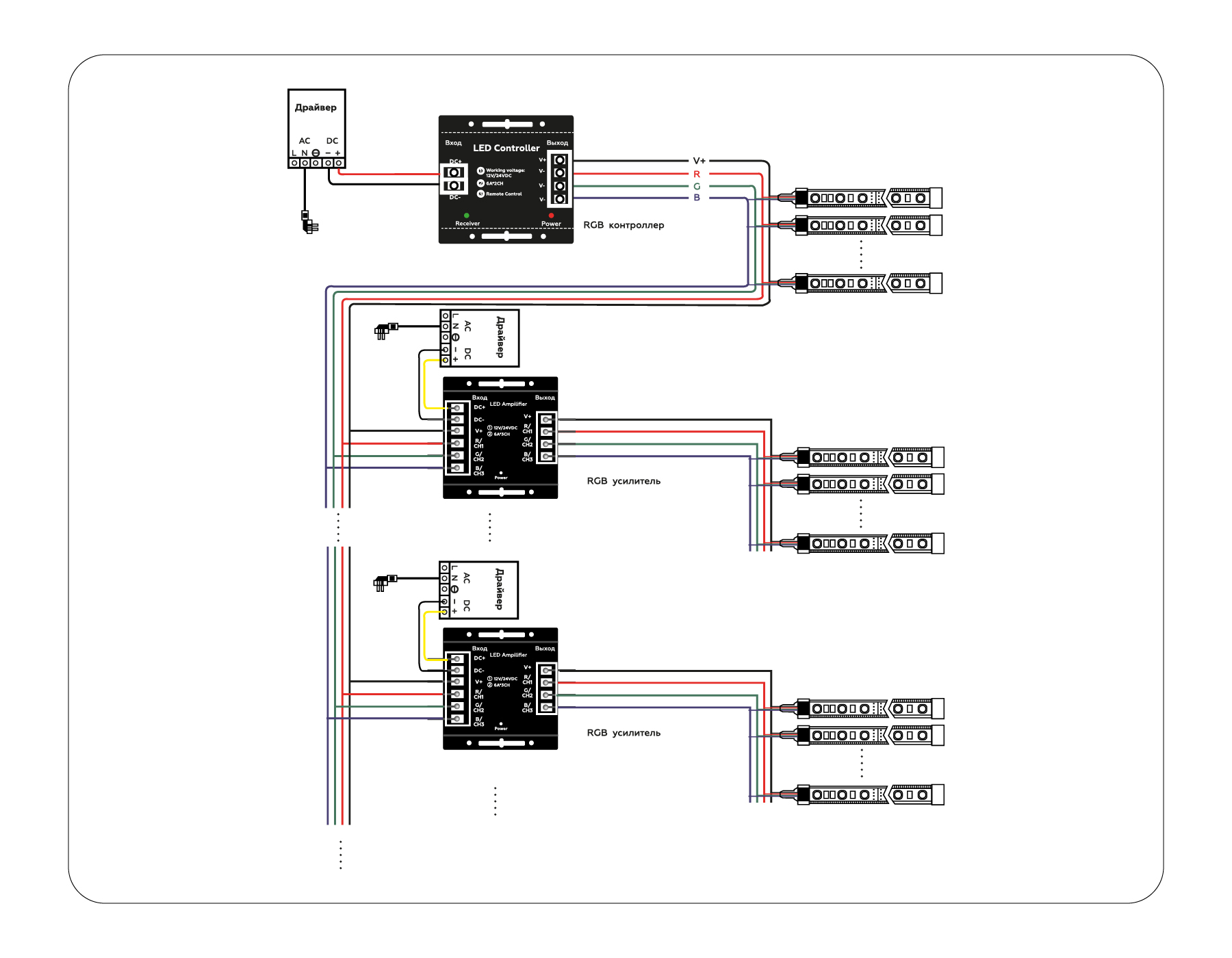 Усилители для светодиодной RGB ленты 12-24V коллекции ILLUMINATION - это устройство, подключаемое в разрыв между отрезками LED ленты и позволяющее управлять одним контуром с помощью одного контроллера.