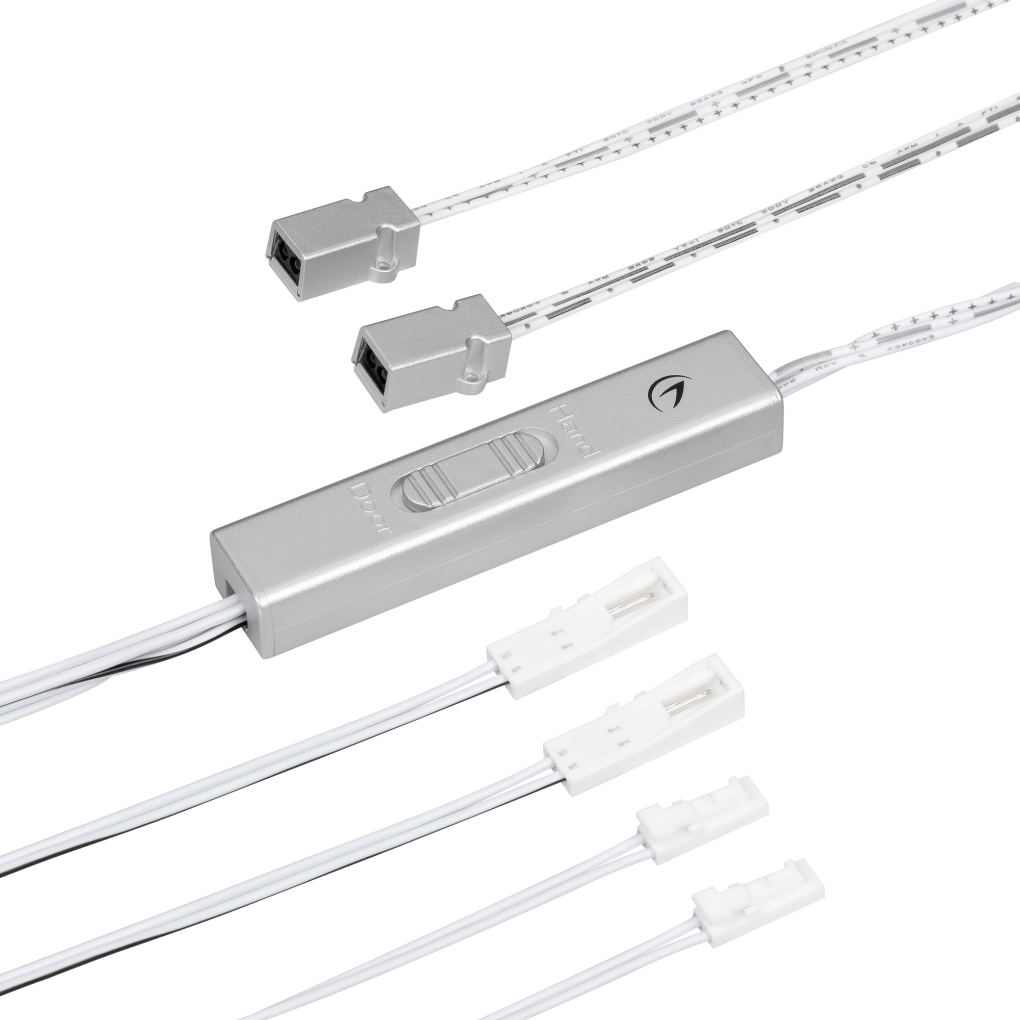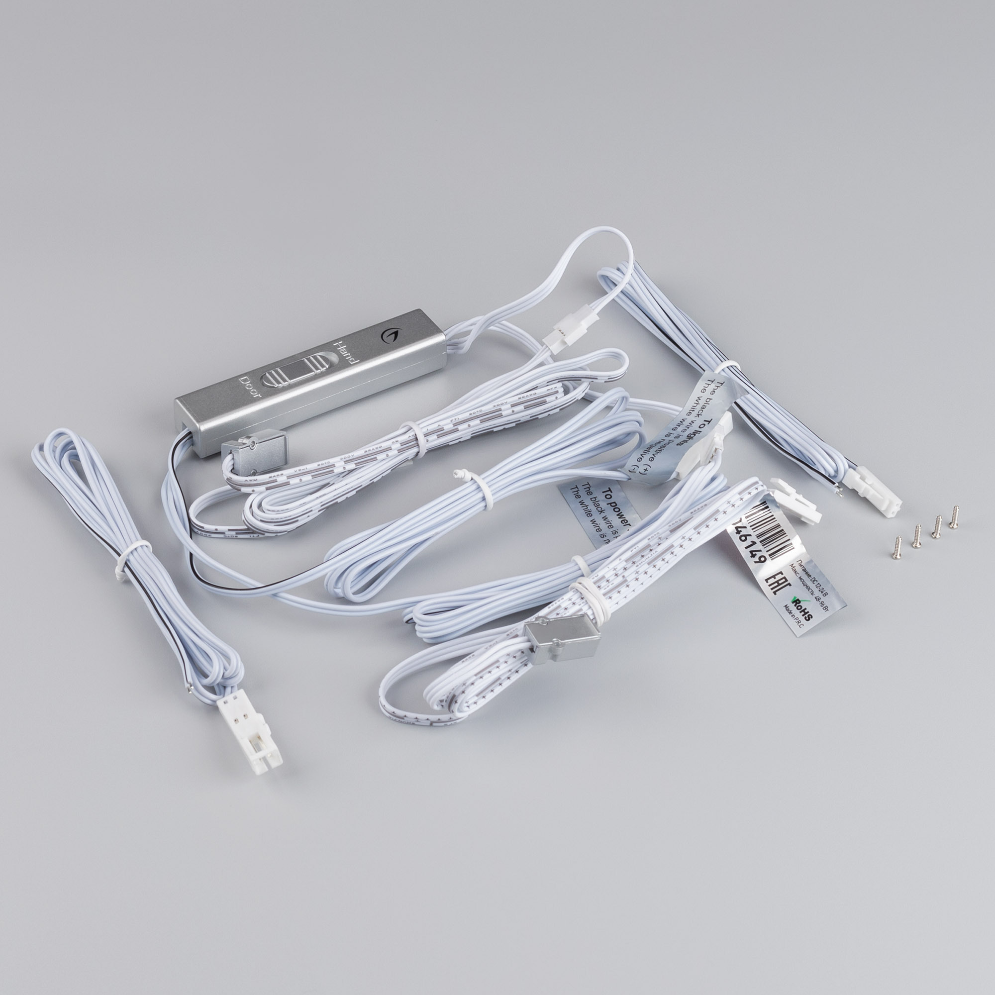 Выключатель для светодиодной ленты 12-24 В. В комплекте 2 датчика. Питание/рабочее напряжение DC 12-24 В, максимальный ток 4 A на канал, 1 канал, максимальная мощность 48-96 Вт. Реагирует на открывание дверей или движение рукой, переключатель между режимами «hand» - «door» расположен на корпусе блока управления. Расстояние срабатывания до 10 см, датчик открыт — «вкл», закрыт — «выкл». Габаритные размеры блока управления: 75 х 15 х 11 мм, кабель 1 м (у датчика), кабель 25 см (питание). Габаритные размеры датчика: 17 x 9 x 7 мм.