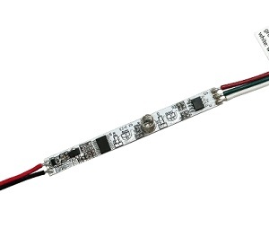 Диммер для двухцветной светодиодной ШИМ ленты MIX, встраиваемый в алюминиевый профиль. Питание/рабочее напряжение 5-24 VDC, максимальный ток 2 A на канал, 2 канала, максимальная мощность 15-72 W. Частота ШИМ 2000 Гц. Включение/выключение, диммирование и настройка цветовой температуры происходят через сенсор прикосновения. 1 сенсорная кнопка. Диапазон диммирования 5-100%. Кривая диммирования - линейная. Размер платы 77x7.8x10 мм, высота пружины 10 мм.