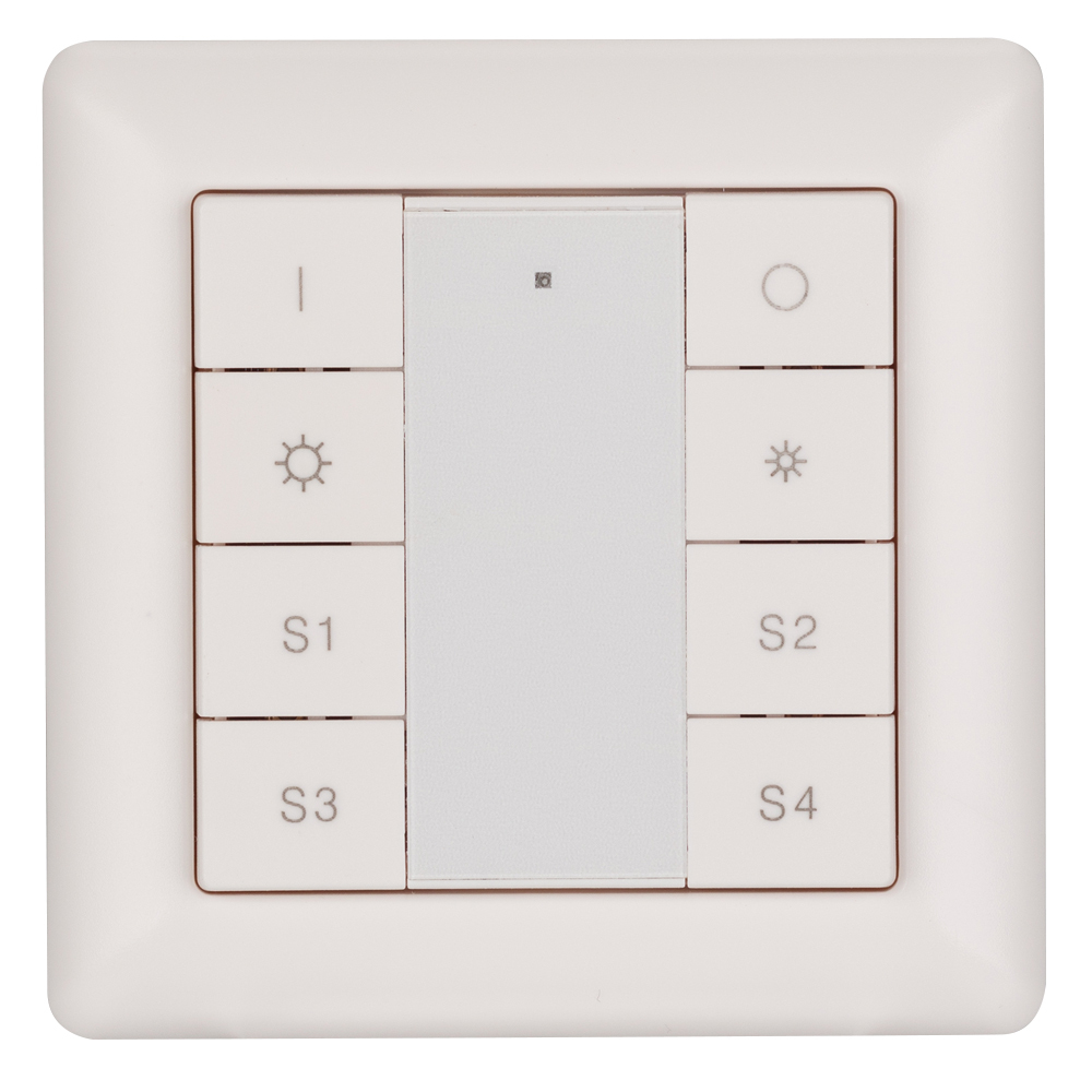 Встраиваемая кнопочная белая пластиковая панель для работы по протоколу DALI. Включение/выключение, диммирование, вызов и сохранение 4-х сцен в 1 группе. Установка номера группы и номера первой сцены выполняется переключателями на корпусе. Питание от шины DALI (4 мА). Стандартная рамка входит в комплект поставки.