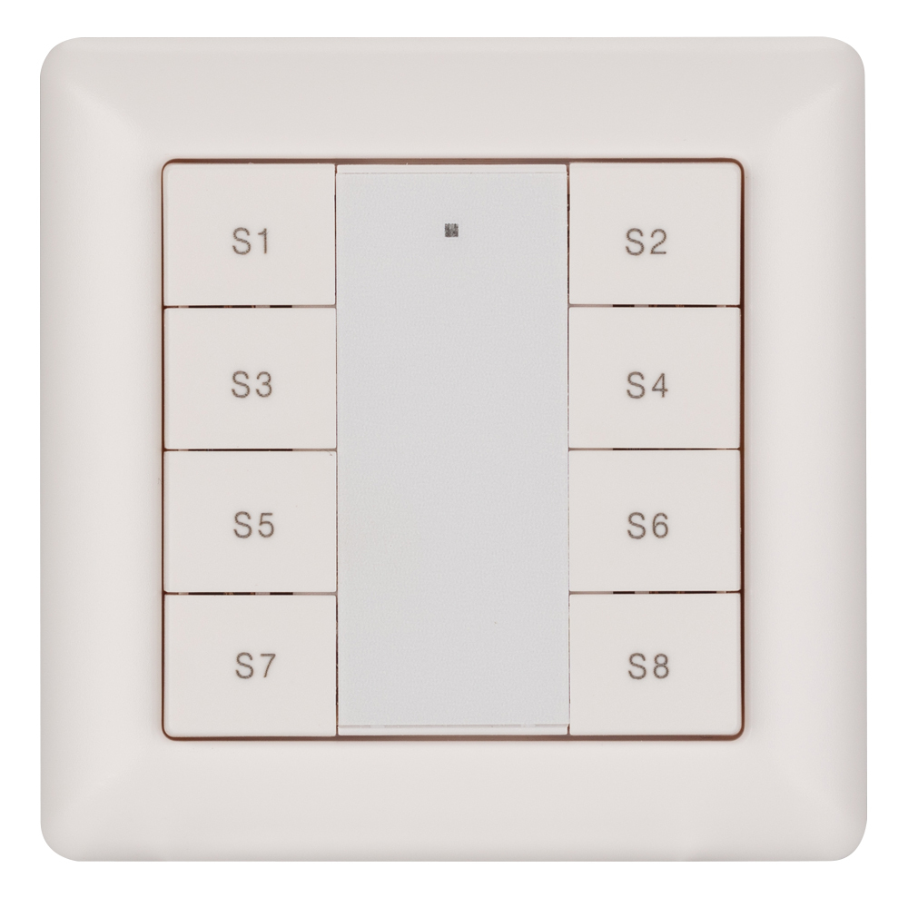 Встраиваемая кнопочная белая пластиковая панель для работы по протоколу DALI. Может устанавливаться как в дополнение к диммирующей панели, так и автономно, для вызова ранее сохраненных сцен в 1 группе управления. Установка номера группы выполняется переключателями на корпусе. 8 кнопок, 8 сцен (вызов). Установка номера первой сцены выполняется переключателями на корпусе. Питание от шины DALI (4 мА). Стандартная рамка входит в комплект поставки.