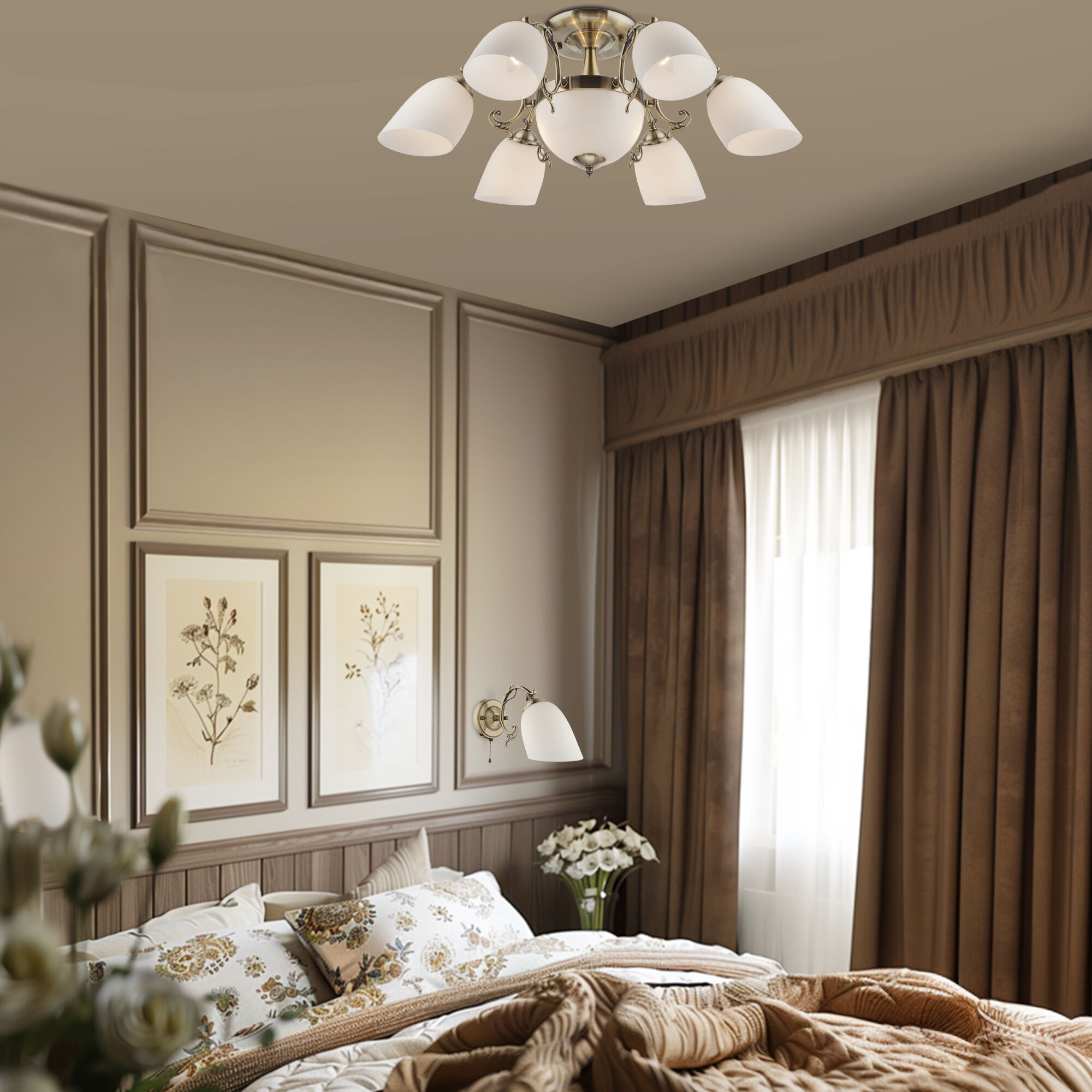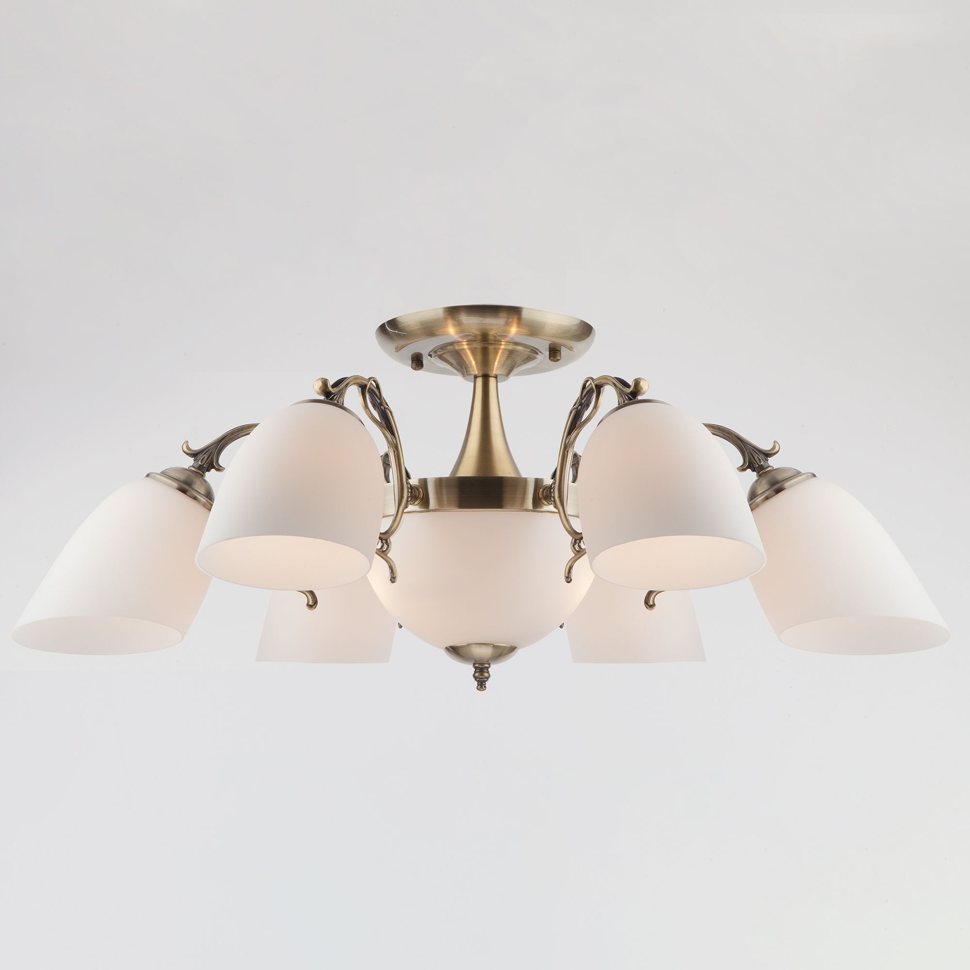 Организовать качественное освещение вам поможет современная потолочная люстра со стеклянными плафонами из коллекции Ariele. Простые эргономичные формы и умеренные тона станут прекрасным дополнением для вашего интерьера, а классический дизайн с нежными белыми плафонами и бронзовым оттенком арматуры привносит в интерьер нотку винтажного очарования и благородства.