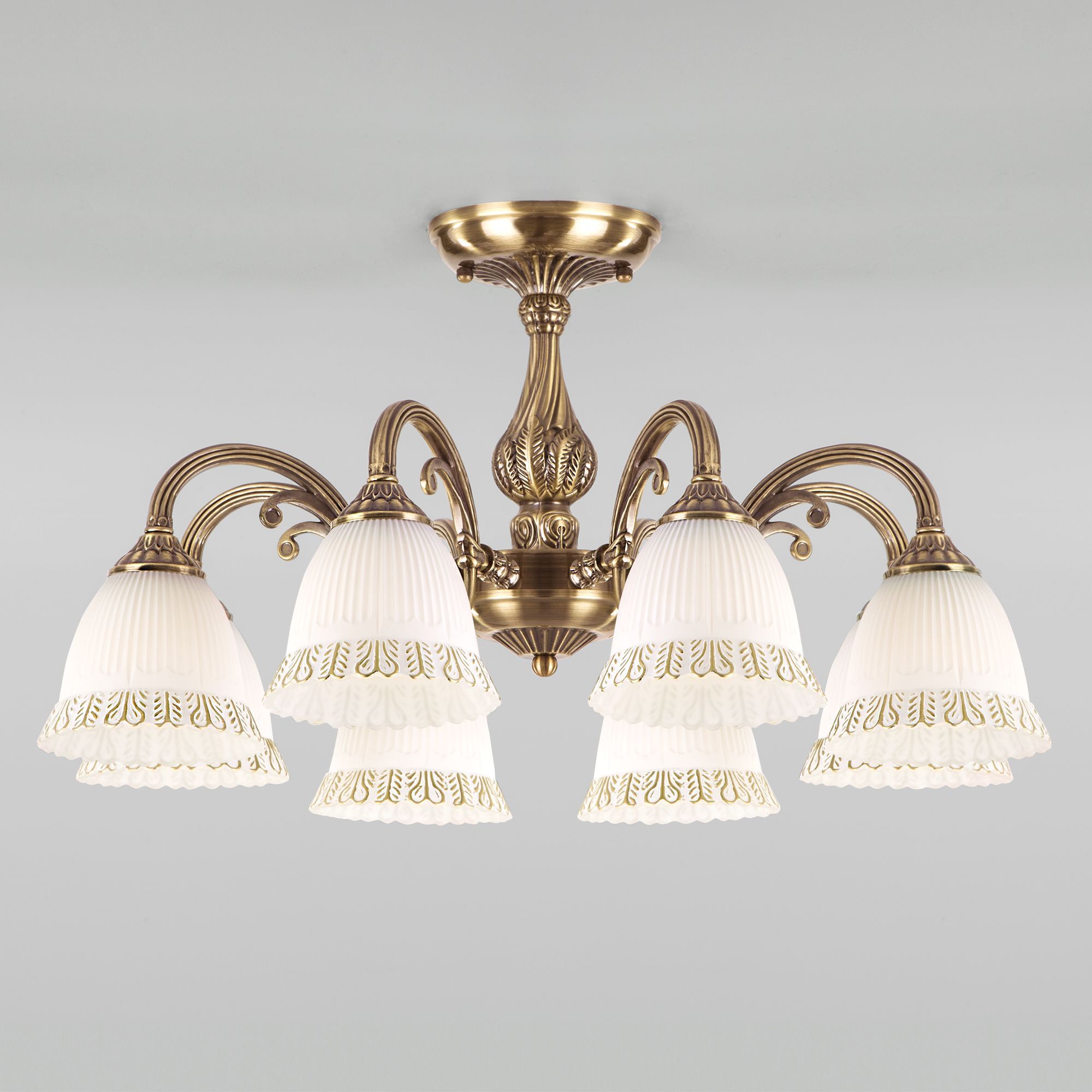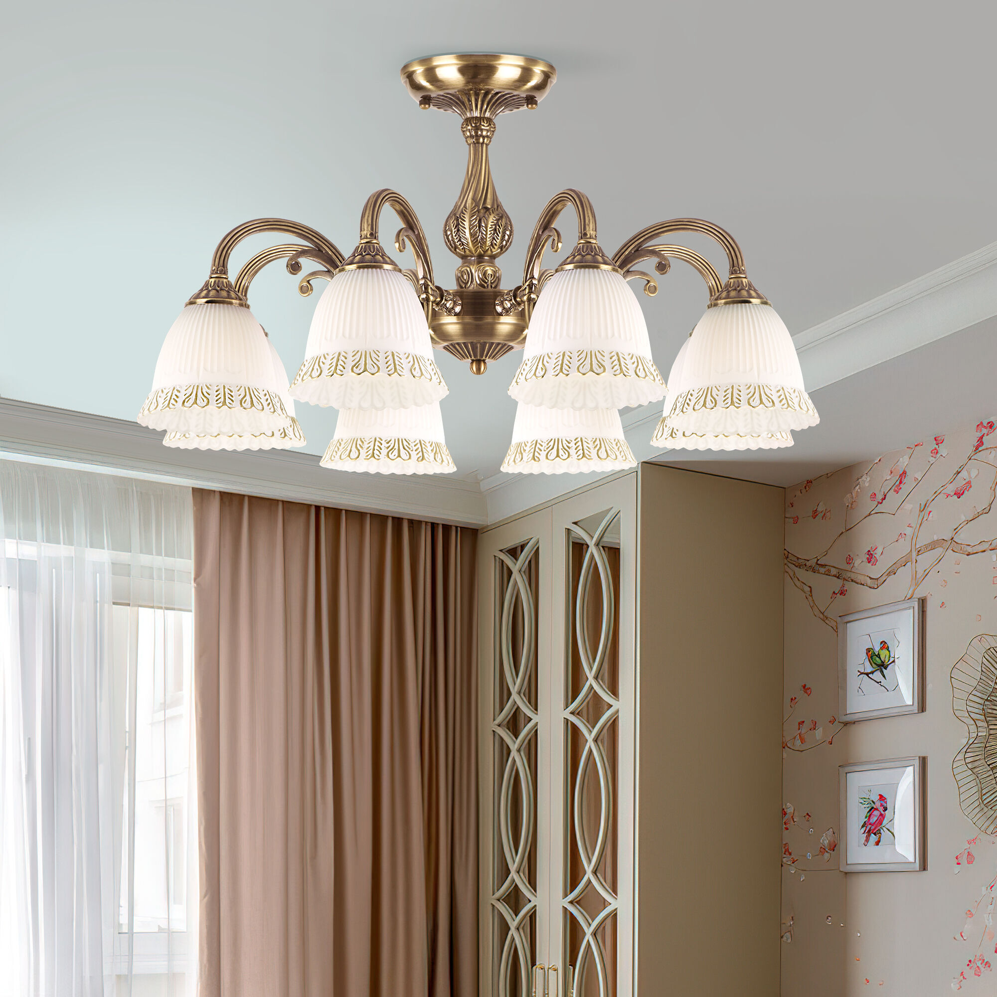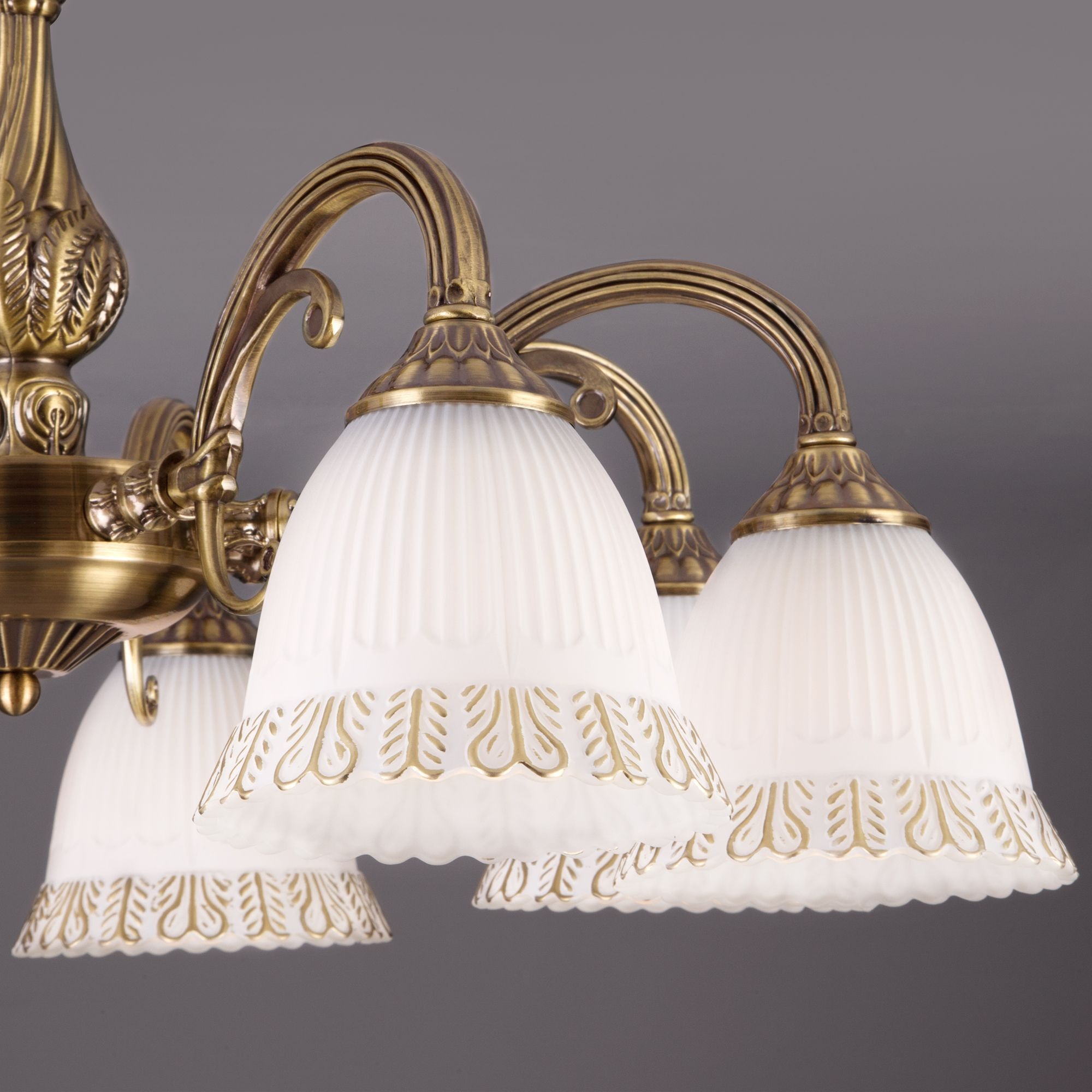 Классическая люстра со стеклянными плафонами 60107/8 античная бронза из коллекции Campina предназначена для создания основного освещения в современных и классических интерьерах. Изящные линии и детали в стиле ретро придают люстре неповторимый шарм и элегантность. Плафоны из матового стекла с золотистым орнаментом обеспечивают равномерное и приятное освещение. Люстра осветит помещение площадью 21 м².