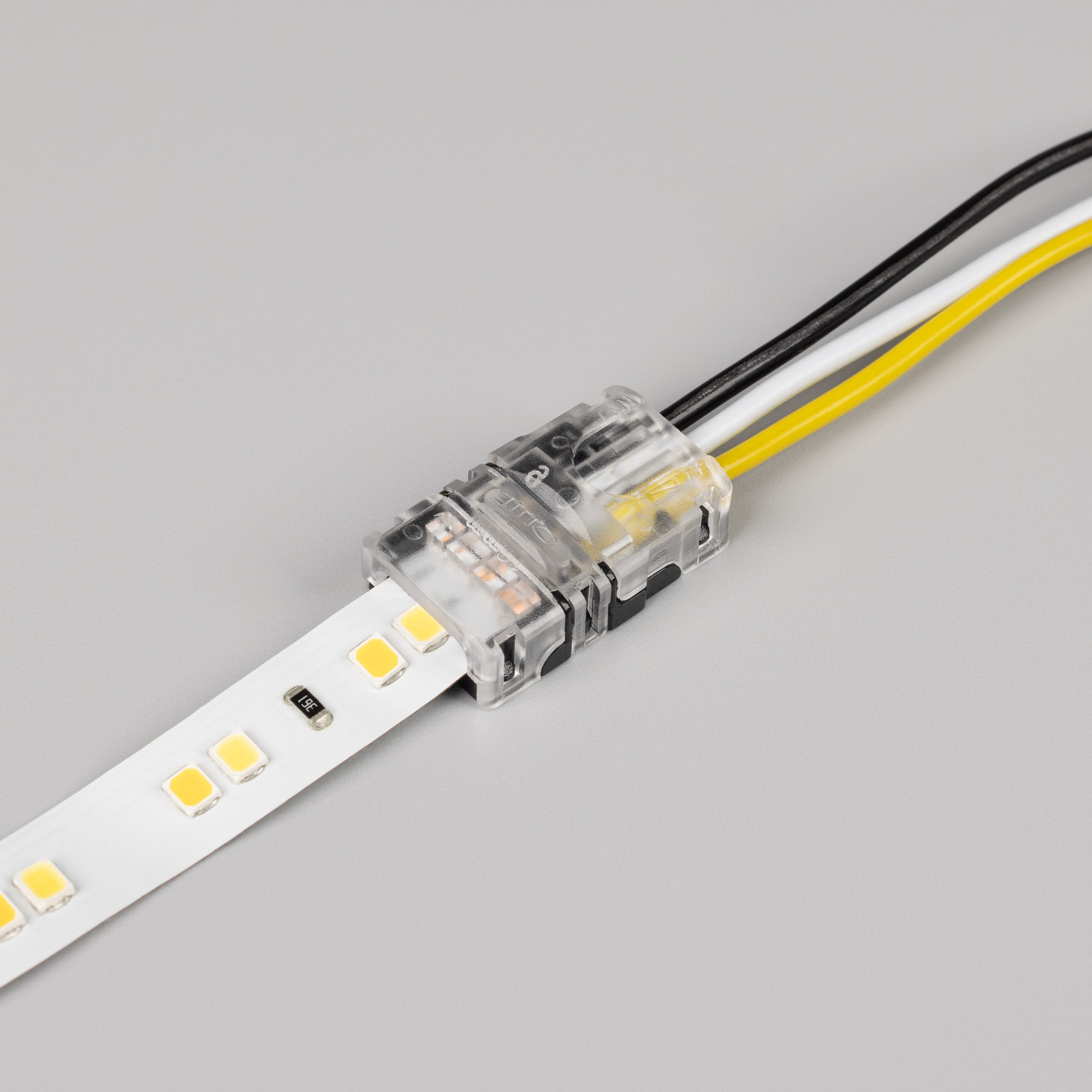 Одиночный коннектор (без провода) для подключения питания к открытым лентам MIX шириной 10 мм. Очистка провода питания (0,34-0,75 мм2) от изоляции не требуется. Материал - прозрачный пластик. Максимальный допустимый ток 3 А, напряжение 3-24 В, степень защиты IP33. Цена за 1 шт. Соединитель для провода и FPC IP33-3PIN, подходит для двухцветной полосы IP33, 18-22AWG 10 шт./пакет