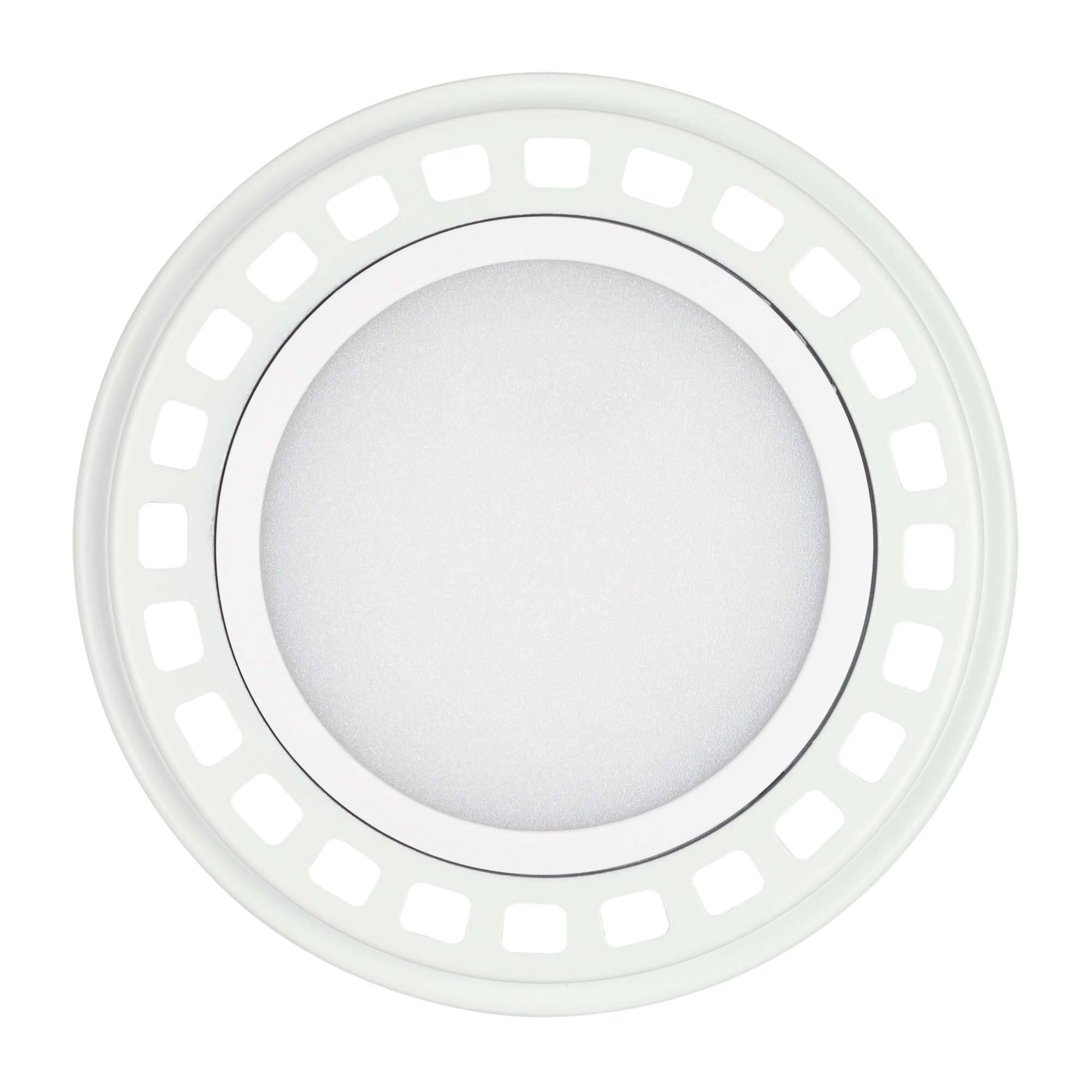 Светодиодная лампа AR111, цоколь GU10, светодиод SMD, цвет БЕЛЫЙ ТЕПЛЫЙ 3000K, угол 120°, мощность 15Вт, напряжение 230V, Индекс цветопередачи CRI>80 Диммер TRIAC Цвет рамки белый