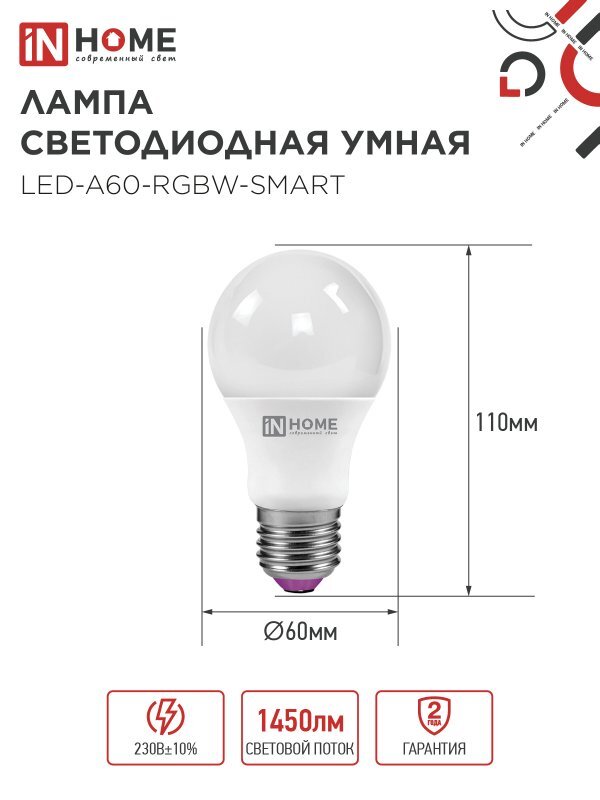 Лампа светодиодная LED-A60-RGBW-SMART 15Вт 3000-6500К E27 1450лм 230В димм. IN HOME 4690612050034