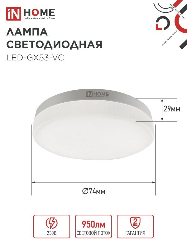 Лампа светодиодная LED-GX53-VC 10PACK 10Вт 230В 6500К 950лм (уп.10шт) IN HOME 4690612043982