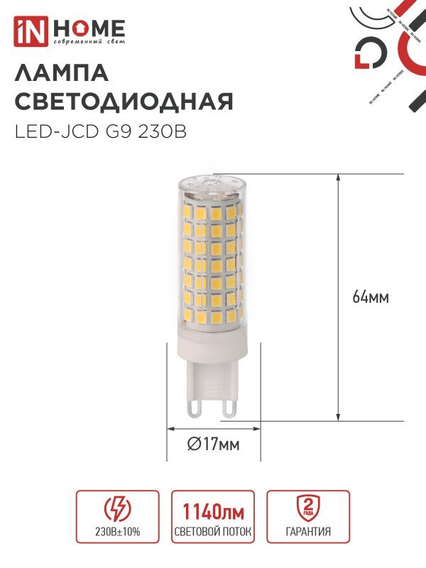 Лампа светодиодная LED-JCD 12Вт 230В G9 4000К 1140лм IN HOME 4690612060323
