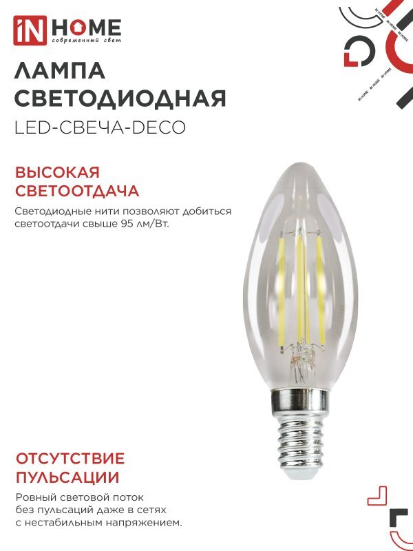 Лампа светодиодная LED-СВЕЧА-deco 12Вт 230В E14 3000К 1350лм прозрачная IN HOME 4690612053660