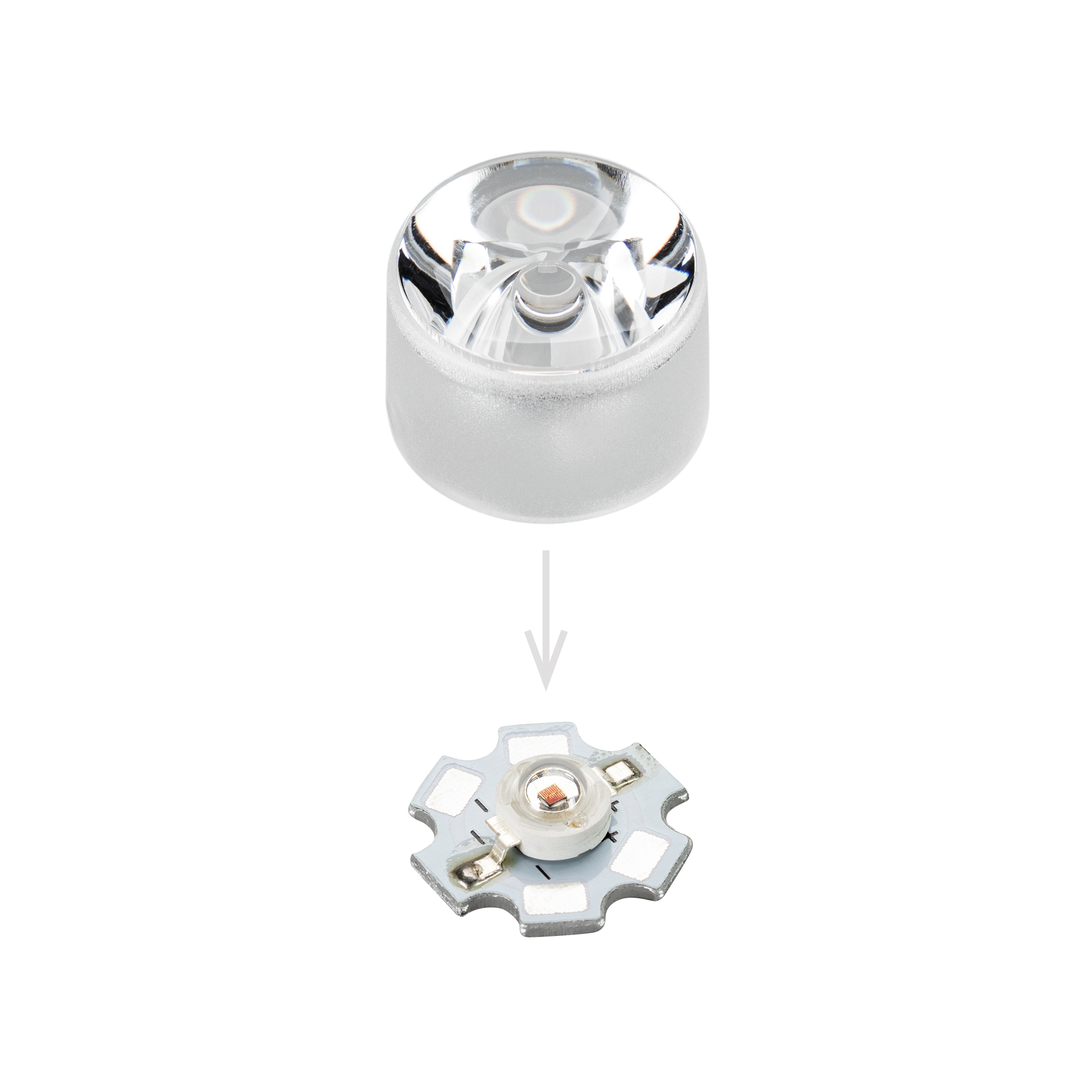 Одиночная линза цельная (с несъемным холдером) для мощного светодиода Emitter. Угол обзора: вертикальный 10°, прозрачная линза. Материал PC. Диаметр 21.8 мм, высота 13.45 мм.