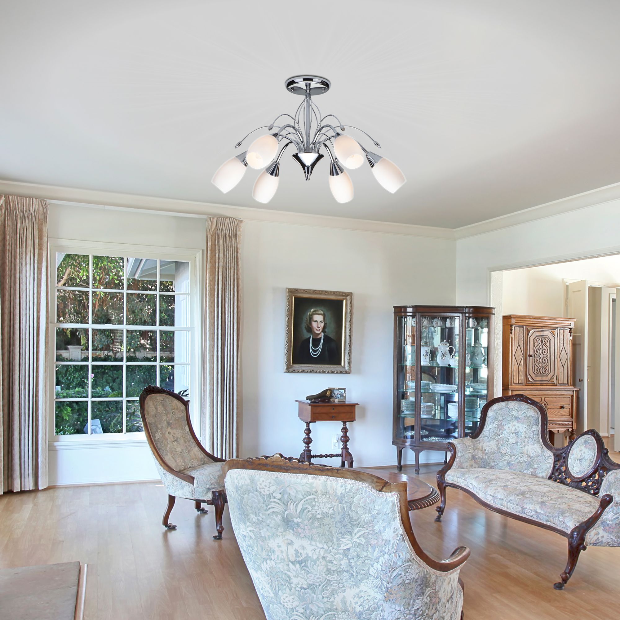 Потолочная люстра украсит помещение и создаст полноценное освещение на площади 11 м². В качестве источника света используются сменные лампы с цоколем E14. Патрон рассчитан на максимальную мощность ламп накаливания 40Вт. В производстве люстры использовали высококачественный металл с надежным защитным покрытием и закаленное матовое стекло.