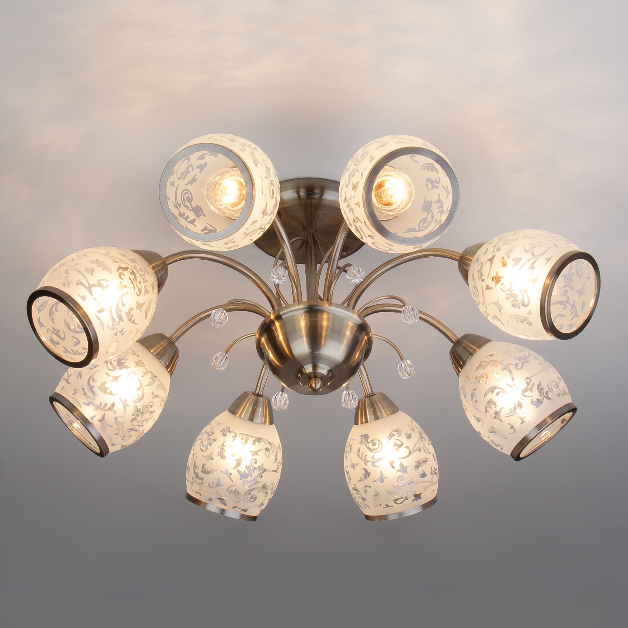 Потолочная люстра с хрусталем 30026/8 античная бронза из коллекции Gabriella предназначена для создания основного освещения в современных и классических интерьерах, подходит для различных типов помещений и рассчитана на площадь освещения 16 м². Она дополнена выразительными стеклянными плафонами с узорами, мягко рассеивающими свет, создавая нежную композицию на потолке. Арматура изготовлена из высококачественного металла с надежным защитным покрытием.
