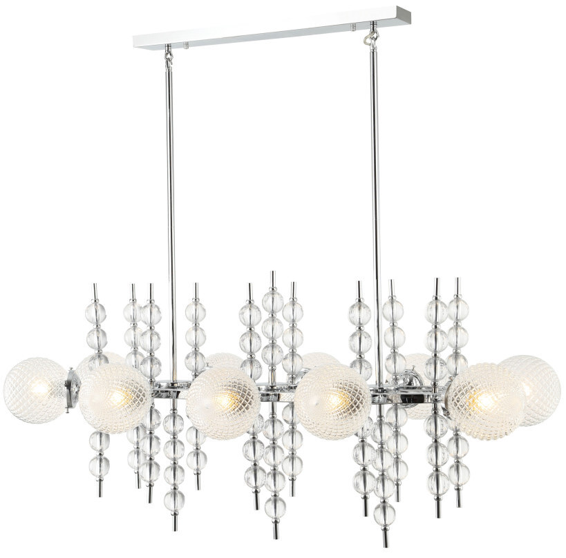 Люстра подвесная на штанге вытянутой формы из коллекции Queenly выполнена из металла, гальванизированного в цвет хрома, и декорирована сферами из прозрачного стекла и плафонами из фактурного прозрачного стекла. Благодаря широкой арматуре люстра коллекции выглядит стильно и респектабельно. Премиальное качество и неповторимыи? дизаи?н светильников идеально подои?дут в современные и дизайнерские интерьеры.