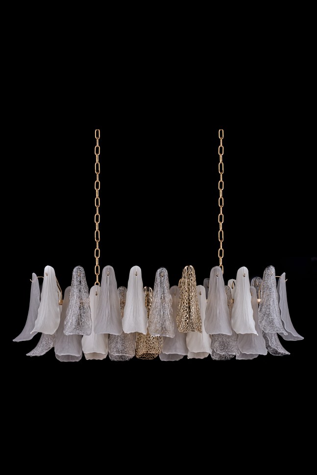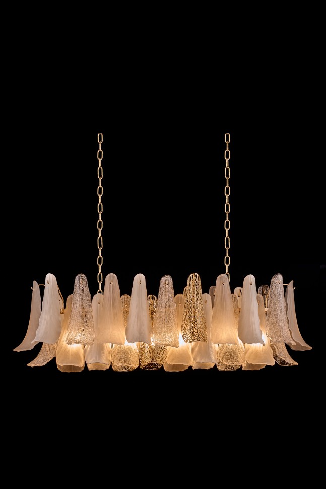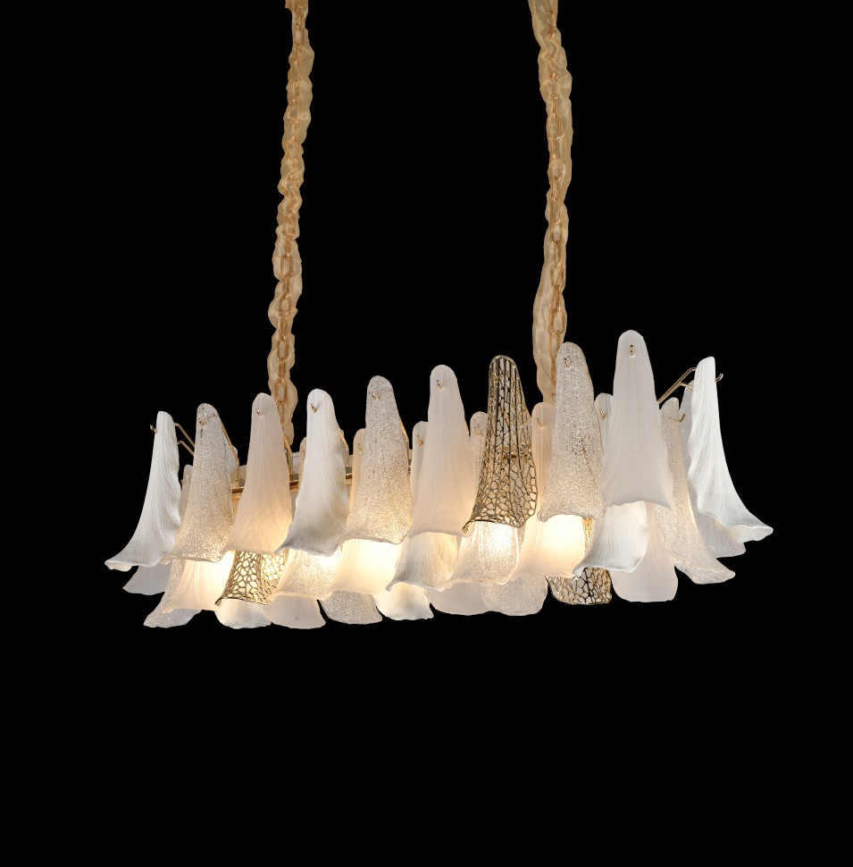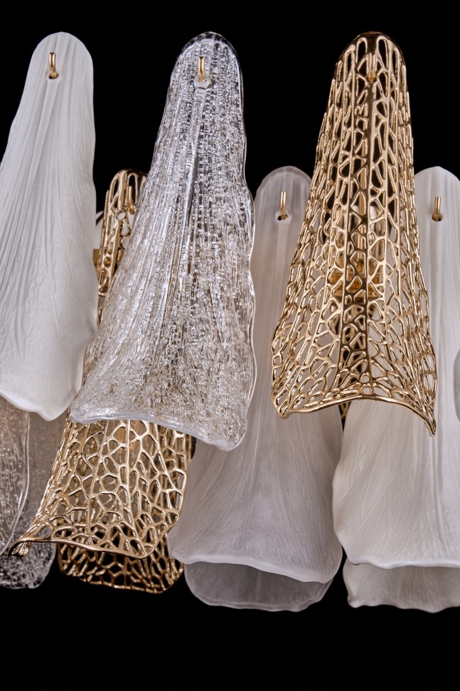 высшего качества. Их форма напоминает лепестки сказочных цветов. Каждый лепесток отличается оригинальной фактурой и отенком. Полупрозрачные хрустальные с жемчужным сиянием; керамические с поверхностью, имитирующей лепестки живых цветов; металлические золотистые с выразительной перфорацией. Вместе они создают гармоничную элегантную композицию. Арматура светильников – из металла с гальваническим покрытием золотого цвета. Коллекция представлена люстрами различных размеров и форм и настенным светильником.
