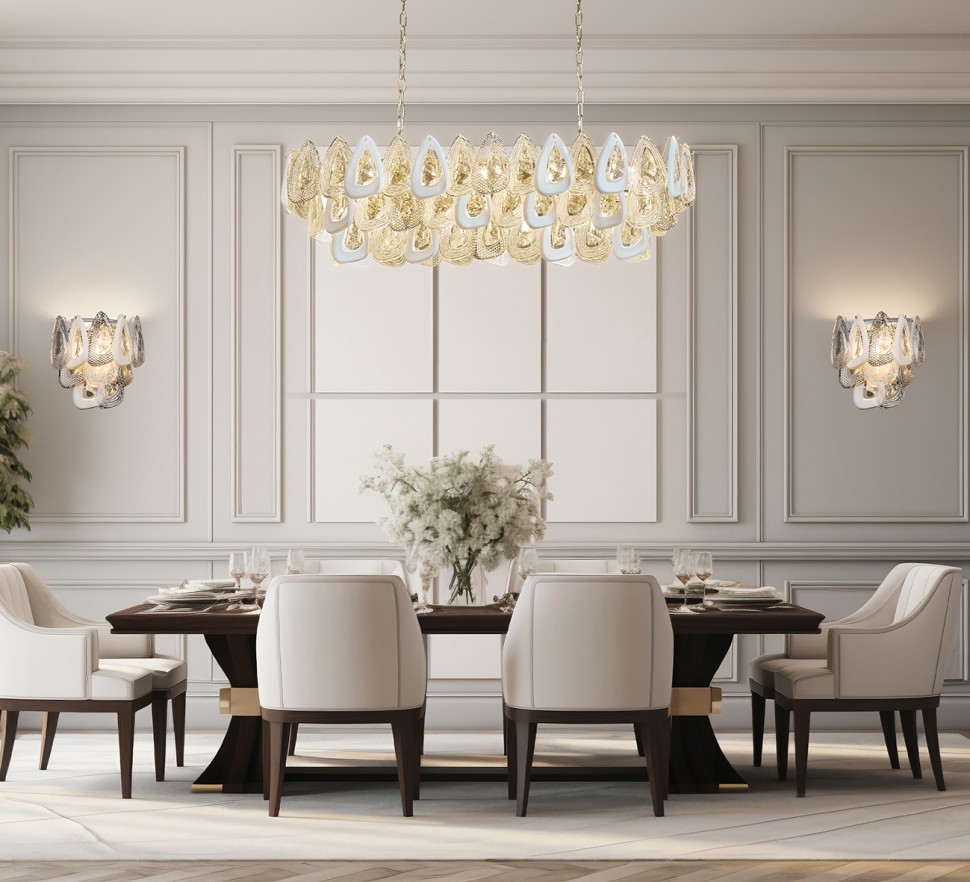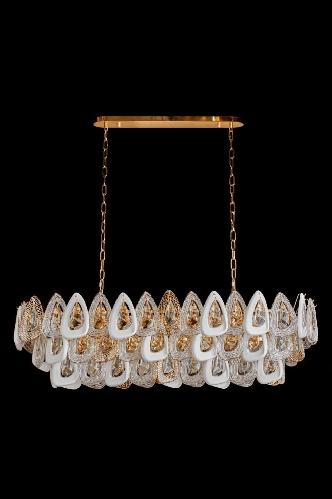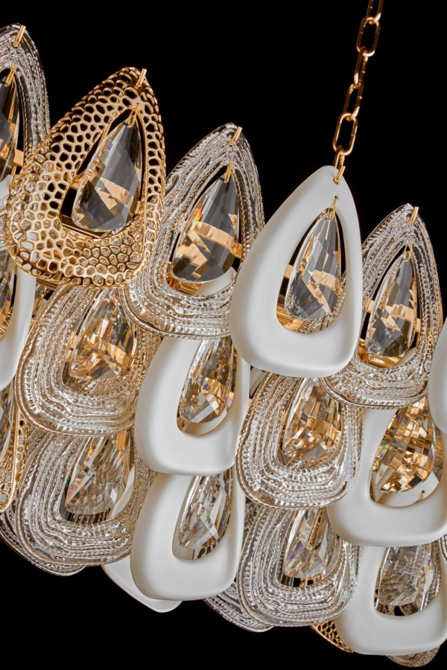 В переводе с итальянского название коллекции – «тонкость, изящество». Оно точно отражает утонченный характер дизайна светильников. Декоративные элементы плафонов выполнены в виде крупных капель из керамики и хрусталя высшего качества. Вместе они создают гармоничную элегантную композицию. Арматура светильников – из металла с гальваническим покрытием золотого цвета. Коллекция представлена люстрами различных размеров и форм и настенным светильником.