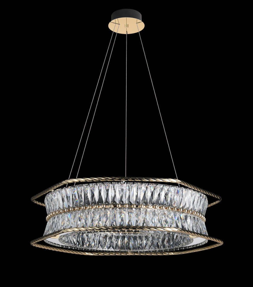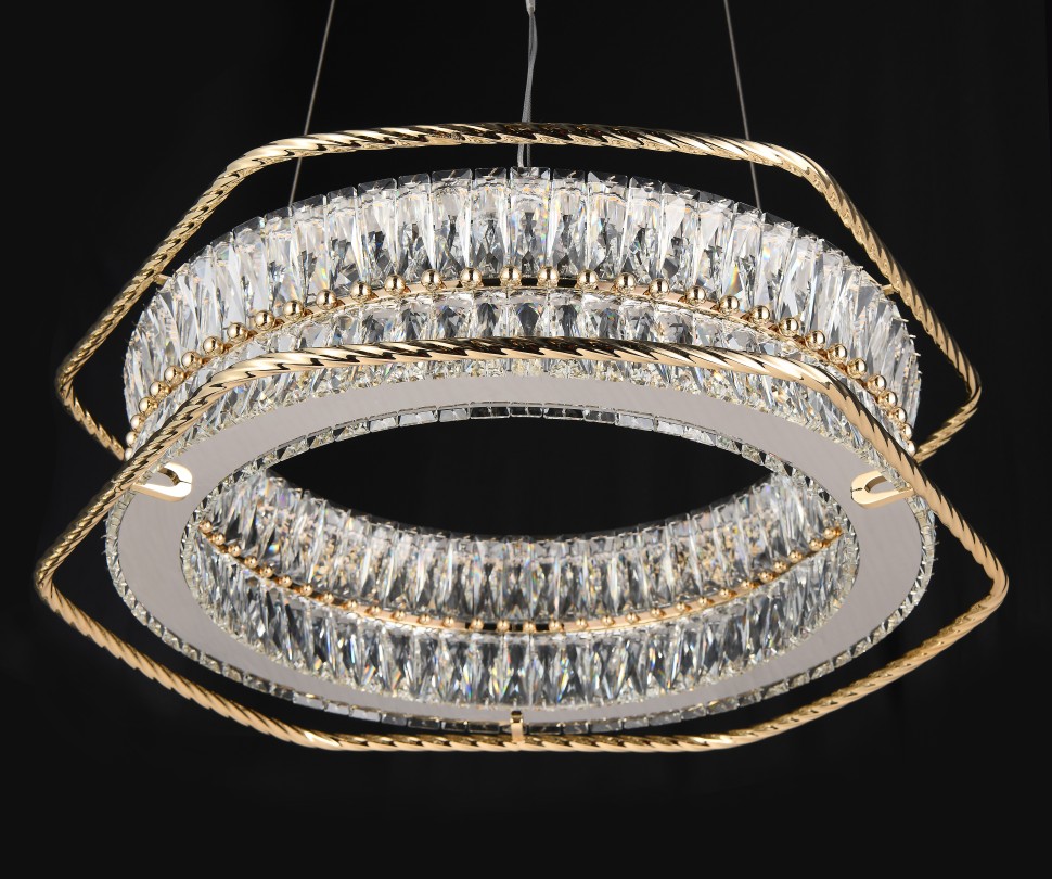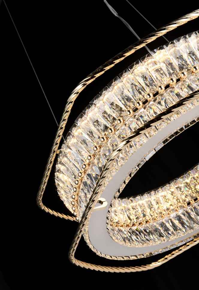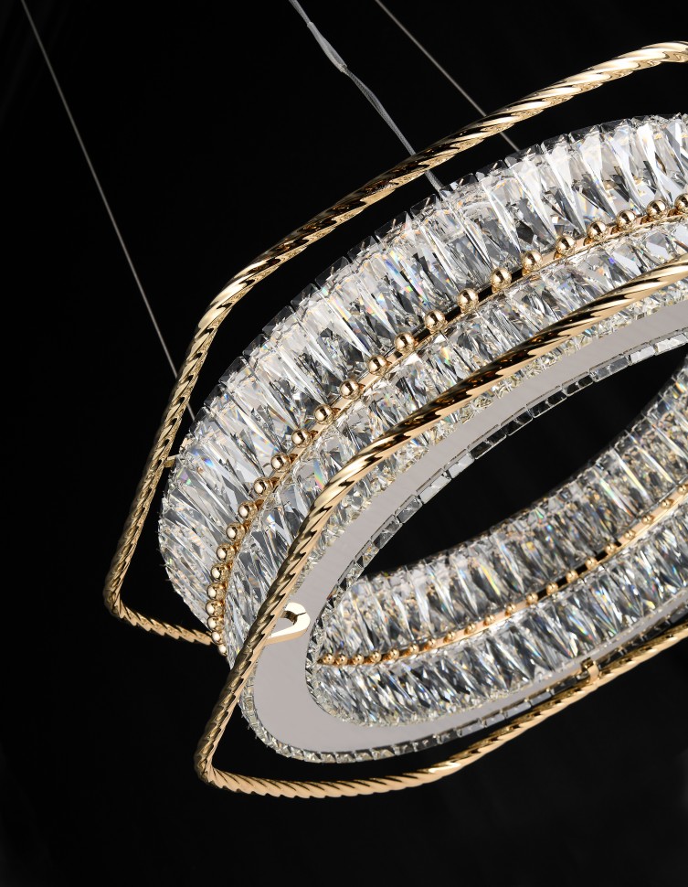 Форма кольца и архитектурные линии отсылают к стилю ар-деко: элегантность, геометрия, лаконичность. Гальваническое покрытие арматуры придаёт изделию благородный блеск, а хрусталь завораживает игрой света. В интерьере такие люстры становятся не просто освещением, а центральным акцентом пространства.