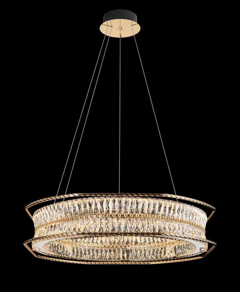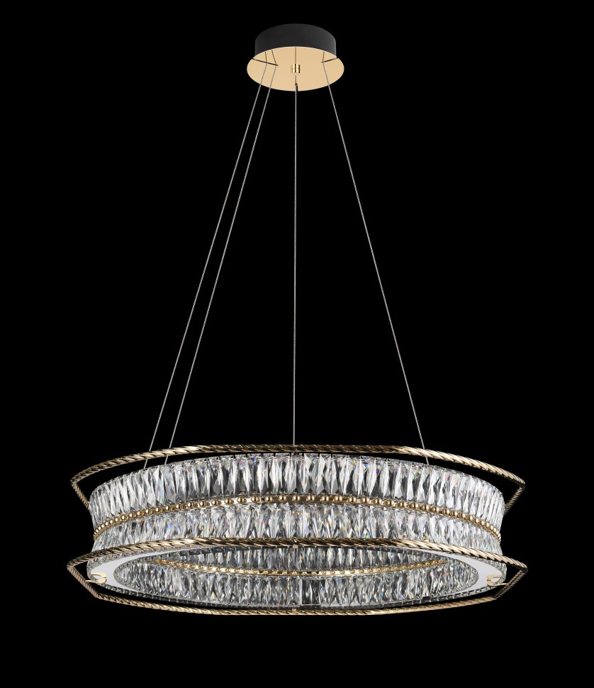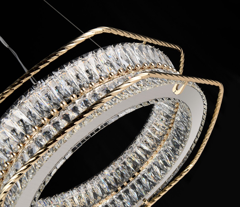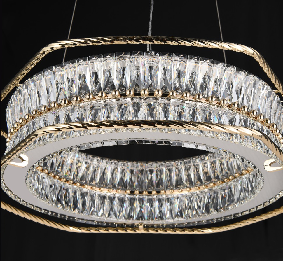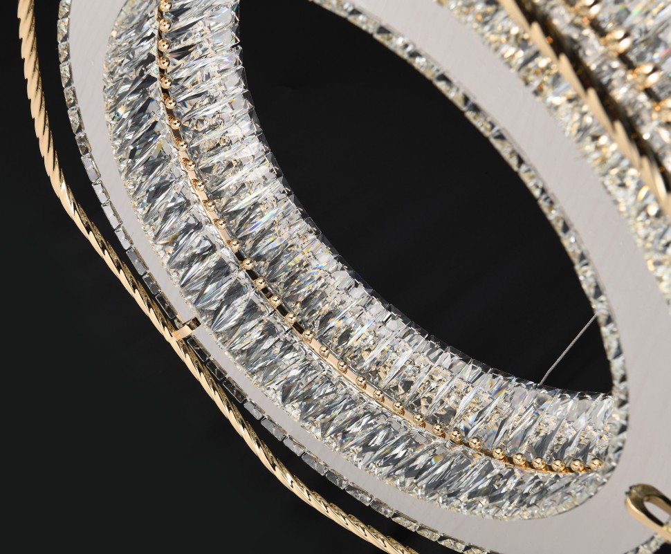 Форма кольца и архитектурные линии отсылают к стилю ар-деко: элегантность, геометрия, лаконичность. Гальваническое покрытие арматуры придаёт изделию благородный блеск, а хрусталь завораживает игрой света. В интерьере такие люстры становятся не просто освещением, а центральным акцентом пространства.